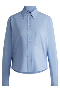 SIZE AND FIT The model wears a size 4 and is 5'8" tall with a, 33" chest, 25" waist and 35" hips. DETAILS Brielle_1_Monday - 50531519 A striped blouse cut to a short, regular fit by BOSS Womenswear. Featuring an embroidered Double B monogram, this style is crafted in stretch cotton. Regular fit Point collar Fastening top: Concealed closure Long sleeves Button cuffs Fit back length: 60 cm (24 inches) QUALITY & CARE INSTRUCTIONS Machine Wash Cold Iron Medium Heat Dry Clean Only Do Not Bleach Do Not Tumble Dry Quality: 74% Cotton, 22% Polyamid, 4% Elastane