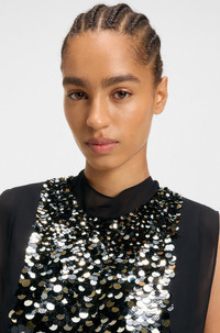 SIZE AND FIT The model wears a size 4 and is 5'9" tall with a, 32" chest, 23" waist and 35" hips. DETAILS With smooth and textured sequins, this BOSS Womenswear blouse makes any look evening-ready. Straight fit. Rear bow detail. Regular fit Stand collar Fastening top: Concealed closure Sleeveless Baliette - 50546946 QUALITY & CARE INSTRUCTIONS Material: 100% Polyester, Top: 96% Viscose, 4% Elastane, Insert: 100% Polyester Do Not Wash Reduced Dry Clean Do Not Tumble Dry Do Not Bleach Iron Low Heat