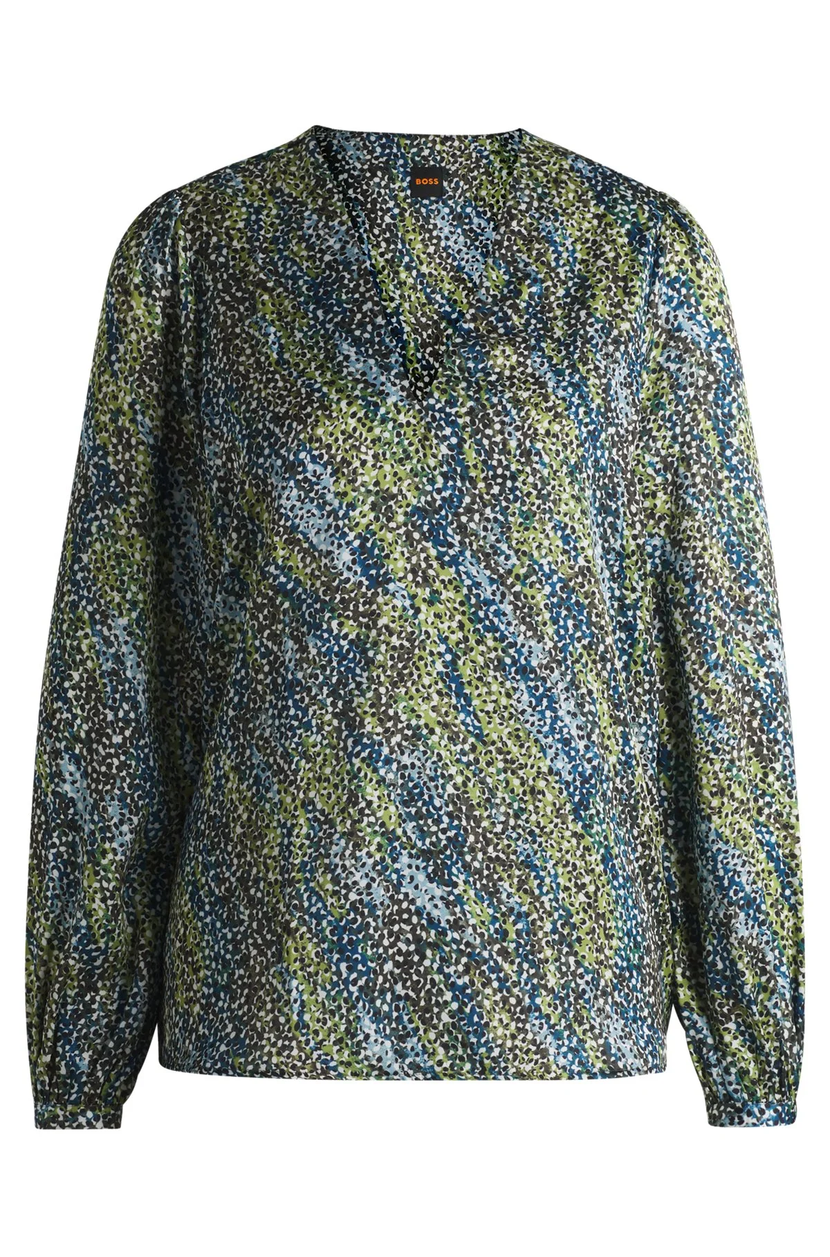 SIZE AND FIT The model wears a size S and is 5'10" tall with a, 31" chest, 24" waist and 35" hips. DETAILS C_Baria - 50536265 A V-neck blouse with voluminous sleeves by BOSS Womenswear. This regular-fit piece is crafted in stretch satin featuring an all-over print. Regular fit Collarless Long sleeves Button cuffs QUALITY & CARE INSTRUCTIONS Do Not Bleach Do Not Tumble Dry Machine Wash Cold Do Not Dry Clean Iron Low Heat Quality: 100% Polyester