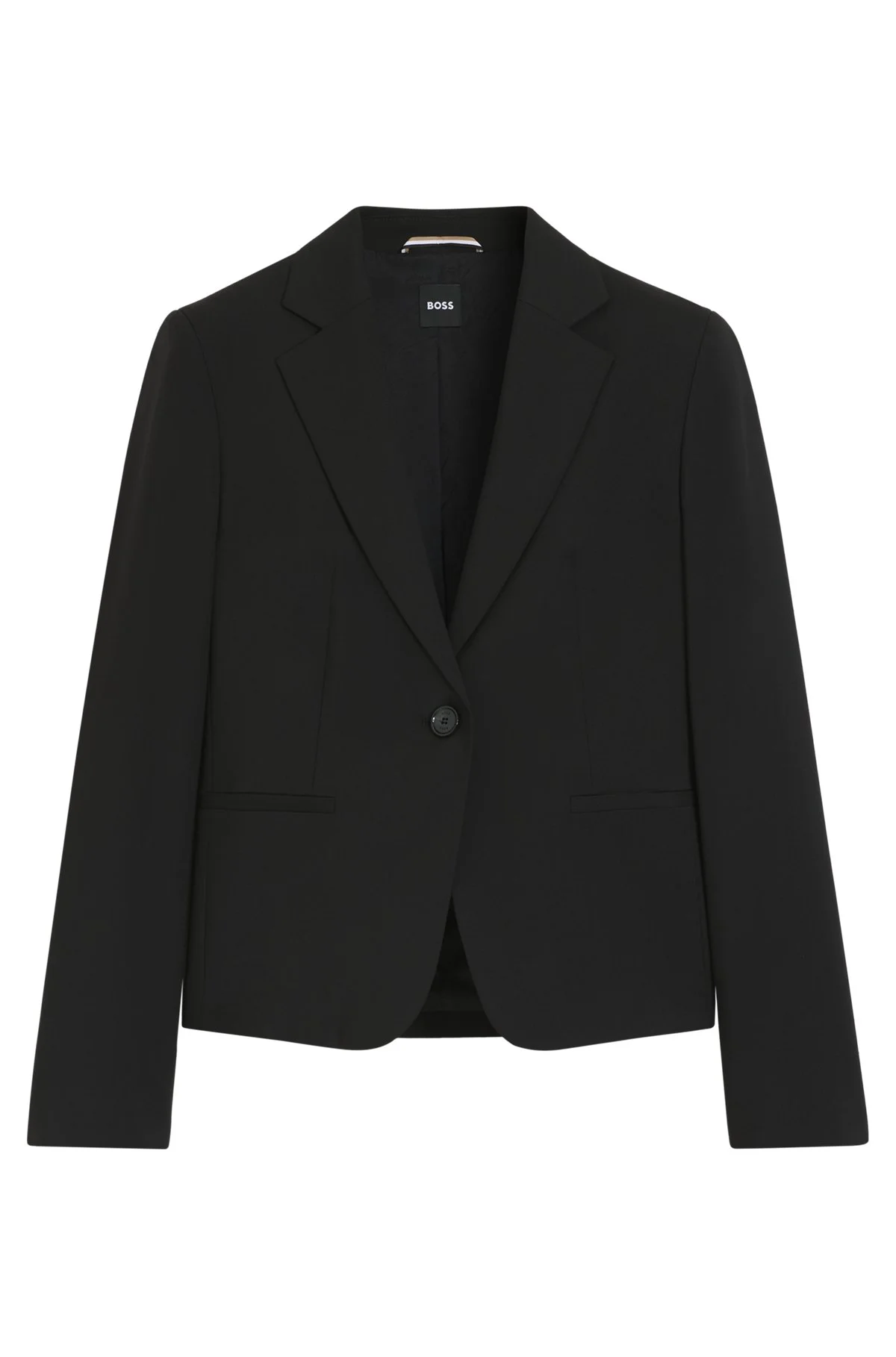 SIZE AND FIT The model wears a size 4 and is 5'10" tall with a, 30" chest, 23" waist and 35" hips. DETAILS Jarua - 50490020 A contemporary jacket cut to a straight fit in virgin wool with a single-breasted front by BOSS Womenswear. Regular fit Notched lapels Number of buttons: 1 Pockets top: Welt pockets No cuffs Fully lined Fit back length: 56 cm (22 inches) QUALITY & CARE INSTRUCTIONS Reduced Dry Clean Do Not Bleach Do Not Tumble Dry Do Not Wash Iron Low Heat Quality: 100% Virgin wool, Lining: 54% Viscose, 43% Polyamid, 3% Elastane, Sleeve lining: 64% Viscose, 36% Polyester