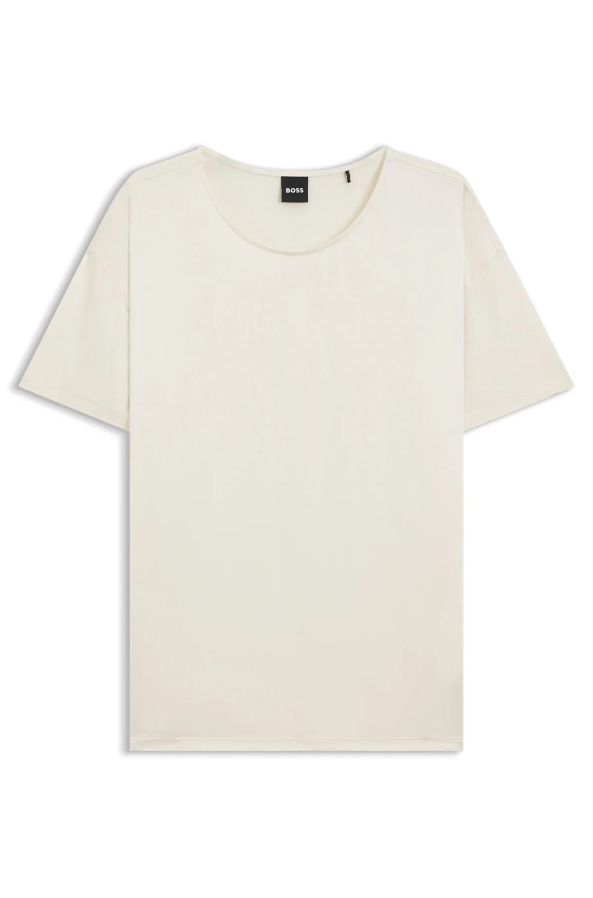 SIZE AND FIT The model wears a size S and is 5'9" tall with a, 31" chest, 24" waist and 35" hips. DETAILS Esandy - 50457656 Easy to style for business or leisure, this regular-fit BOSS Womenswear T-shirt features a stretch-silk front. Sleeves and back in soft-touch fabric. Regular fit Neckline: Crew neck Short sleeves Standard length QUALITY & CARE INSTRUCTIONS Hand Wash Only Quality: 100% Viscose, Front panel: 94% Silk, 6% Elastane Do Not Tumble Dry Iron Low Heat Do Not Bleach Reduced Dry Clean