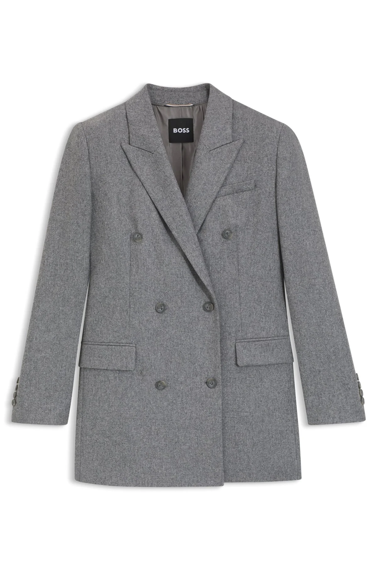 DETAILS Jukana - 50548736 Designed in soft flannel, this regular-fit BOSS Womenswear blazer is ideal for all kinds of winter events. Blended with wool. Peak lapels. Regular fit Peaked lapels Fastening top: Button closure Number of buttons: Double-breasted Pockets top: Flap pockets Kissing buttons on the cuff Back vent Fully lined Fit back length: 78 cm (31 inches) QUALITY & CARE INSTRUCTIONS Do Not Tumble Dry Reduced Dry Clean Iron Low Heat Do Not Wash Do Not Bleach Quality: 44% Wool, 35% Lyocell, 21% Polyamid, Lining: 55% Polyester, 45% Viscose