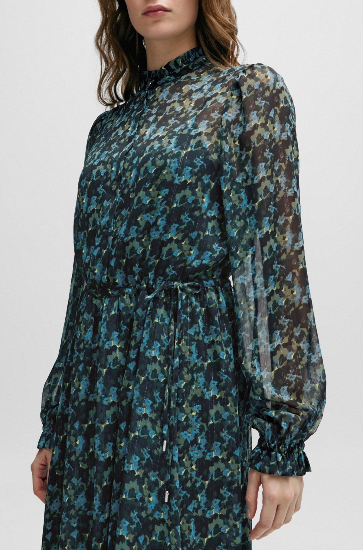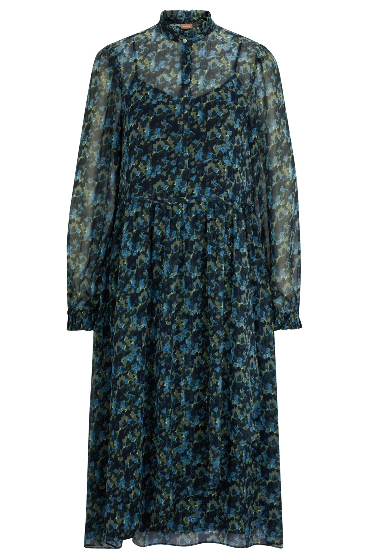 SIZE AND FIT The model wears a size 4 and is 5'8" tall with a, 32" chest, 24" waist and 36" hips. DETAILS C_Dusica - 50507633 A regular-fit dress in stretch chiffon with a digital print, sparkle details and an inner slip dress by BOSS Womenswear. Regular fit Neckline: Stand collar Fastening top: Drawstring closure Long sleeves Elasticized cuffs Partially lined Fit back length: 120 cm (47 inches) QUALITY & CARE INSTRUCTIONS Do Not Bleach Do Not Tumble Dry Hand Wash Only Dry Clean Only Iron Low Heat Quality: 97% Polyester, 3% Metallizing, Inner dress: 100% Polyester