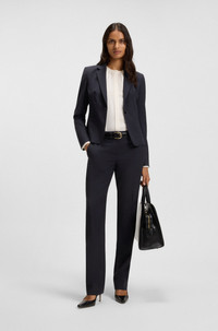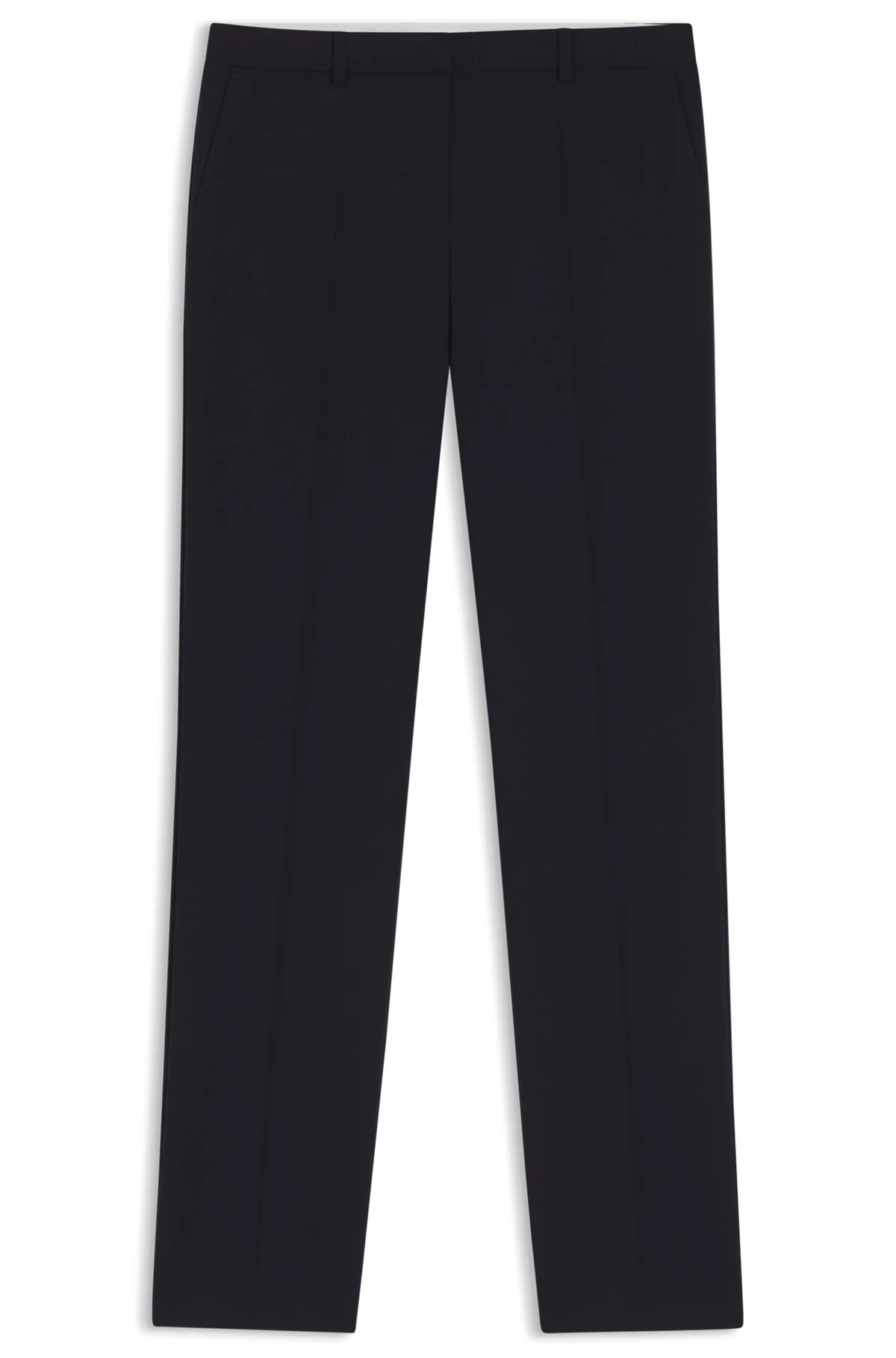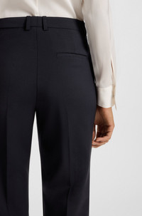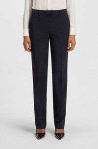 SIZE AND FIT The model wears a size 2 and is 5'8" tall with a, 30" chest, 23" waist and 35" hips. DETAILS Tameah - 50490045 Create elegant looks to take you from desk to dinner with these straight-leg trousers by BOSS Womenswear. Italian virgin wool. Regular fit High waist. Regular fit High rise Hook and zip closure Straight leg Crease Pockets bottom front: French pocket Pockets bottom back: Welt pocket Fit foot width: 38,0 cm (15.0 inches) QUALITY & CARE INSTRUCTIONS Quality: 100% Virgin wool, pocketing: 100% Cotton Do Not Tumble Dry Do Not Bleach Do Not Wash Iron Low Heat Reduced Dry Clean