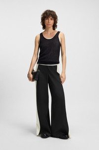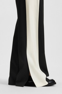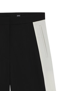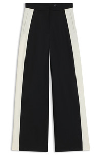 SIZE AND FIT The model wears a size 4 and is 5'9" tall with a, 31" chest, 24" waist and 35" hips. DETAILS Tianal - 50543410 Crafted in virgin-wool twill, these BOSS Womenswear trousers feature statement color-blocking at the side seams. Straight fit with wide leg. Extra long length Regular fit High rise Hook and zip closure Wide leg Crease Pockets bottom front: Ticket pocket Fit foot width: 67,5 cm (26.6 inches) QUALITY & CARE INSTRUCTIONS Do Not Tumble Dry Quality: 100% Virgin wool, pocketing: 55% Polyester, 45% Viscose, side part: 100% Virgin wool Reduced Dry Clean Iron Low Heat Do Not Wash Do Not Bleach