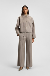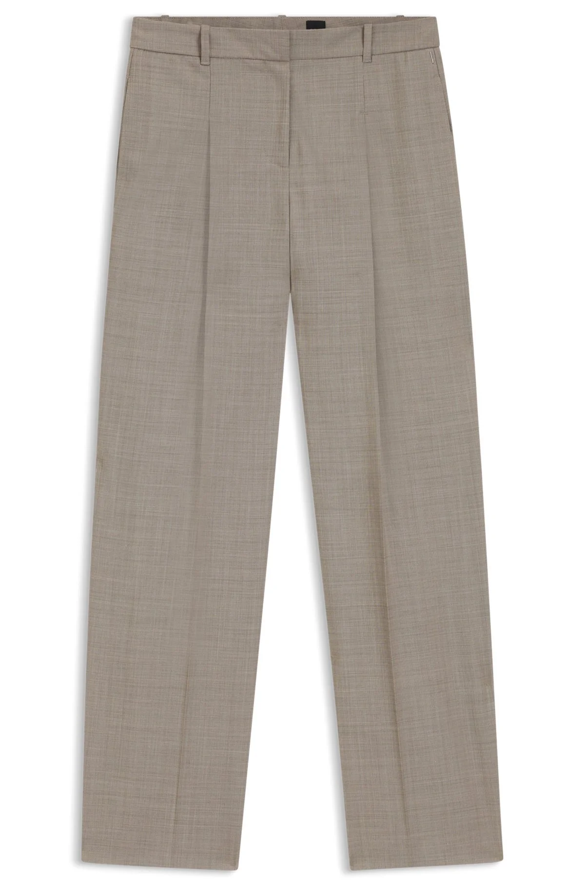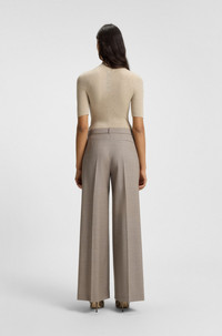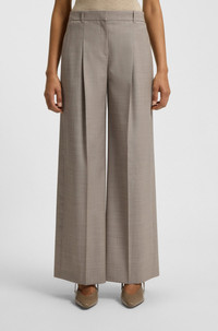 DETAILS Tiana4 - 50554534 Crafted in stretch virgin wool with a classic sharkskin weave, these BOSS Womenswear trousers are an updated formal essential. Straight fit with a wide leg. Regular fit Regular rise Hook and zip closure Wide leg Crease Pockets bottom front: Side pockets Pockets bottom back: Welt pocket Fit foot width: 62,0 cm (24.4 inches) QUALITY & CARE INSTRUCTIONS Reduced Dry Clean Do Not Bleach Do Not Tumble Dry Quality: 99% Virgin wool, 1% Elastane, pocketing: 55% Polyester, 45% Viscose Do Not Wash Iron Low Heat