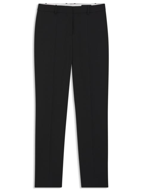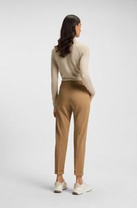 SIZE AND FIT The model wears a size 4 and is 5'10" tall with a, 30" chest, 23" waist and 35" hips. DETAILS Tachinoa - 50490057 Cropped regular-rise trousers cut to a straight fit with a tapered leg in stretch twill by BOSS Womenswear. Regular fit Regular rise Button closure Tapered leg Pleat front Pockets bottom front: Side pockets Pockets bottom back: Welt pocket Fit foot width: 33,0 cm (13.0 inches) QUALITY & CARE INSTRUCTIONS Do Not Tumble Dry Do Not Bleach Quality: 97% Cotton, 3% Elastane, pocketing: 100% Cotton Machine Wash Cold Gentle Iron Low Heat Reduced Dry Clean