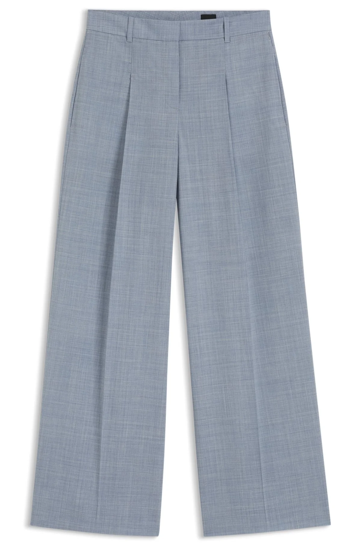 SIZE AND FIT The model wears a size 4 and is 5'9" tall with a, 31" chest, 23" waist and 35" hips. DETAILS With pleats and a wide, straight fit, these BOSS Womenswear trousers create a modern formal profile. Crafted in melange wool with natural stretch. Regular fit Regular rise Hook and zip closure Wide leg Pleat front Pockets bottom front: Side pockets Pockets bottom back: Welt pocket Fit foot width: 62,0 cm (24.4 inches) Tiana4 - 50554965 QUALITY & CARE INSTRUCTIONS Material: 100% Virgin wool, pocketing: 55% Polyester, 45% Viscose Do Not Bleach Do Not Tumble Dry Do Not Wash Iron Low Heat Reduced Dry Clean