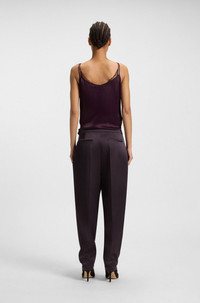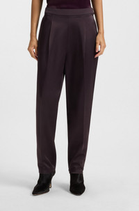SIZE AND FIT The model wears a size 4 and is 5'9" tall with a, 32" chest, 23" waist and 35" hips. DETAILS In a straight fit with a cropped, tapered leg, these BOSS Womenswear trousers create a contemporary formal profile. Soft sable fabric. Regular fit High rise Zip closure Tapered leg Crease Pockets bottom front: Side pockets Pockets bottom back: Welt pocket Fit foot width: 36,0 cm (14.2 inches) Takerana1 - 50548218 QUALITY & CARE INSTRUCTIONS Do Not Bleach Reduced Dry Clean Material: 72% Acetate, 28% Viscose, Lining: 55% Polyester, 45% Viscose, Waistband: 72% Acetate, 28% Viscose Do Not Wash Iron Low Heat Do Not Tumble Dry