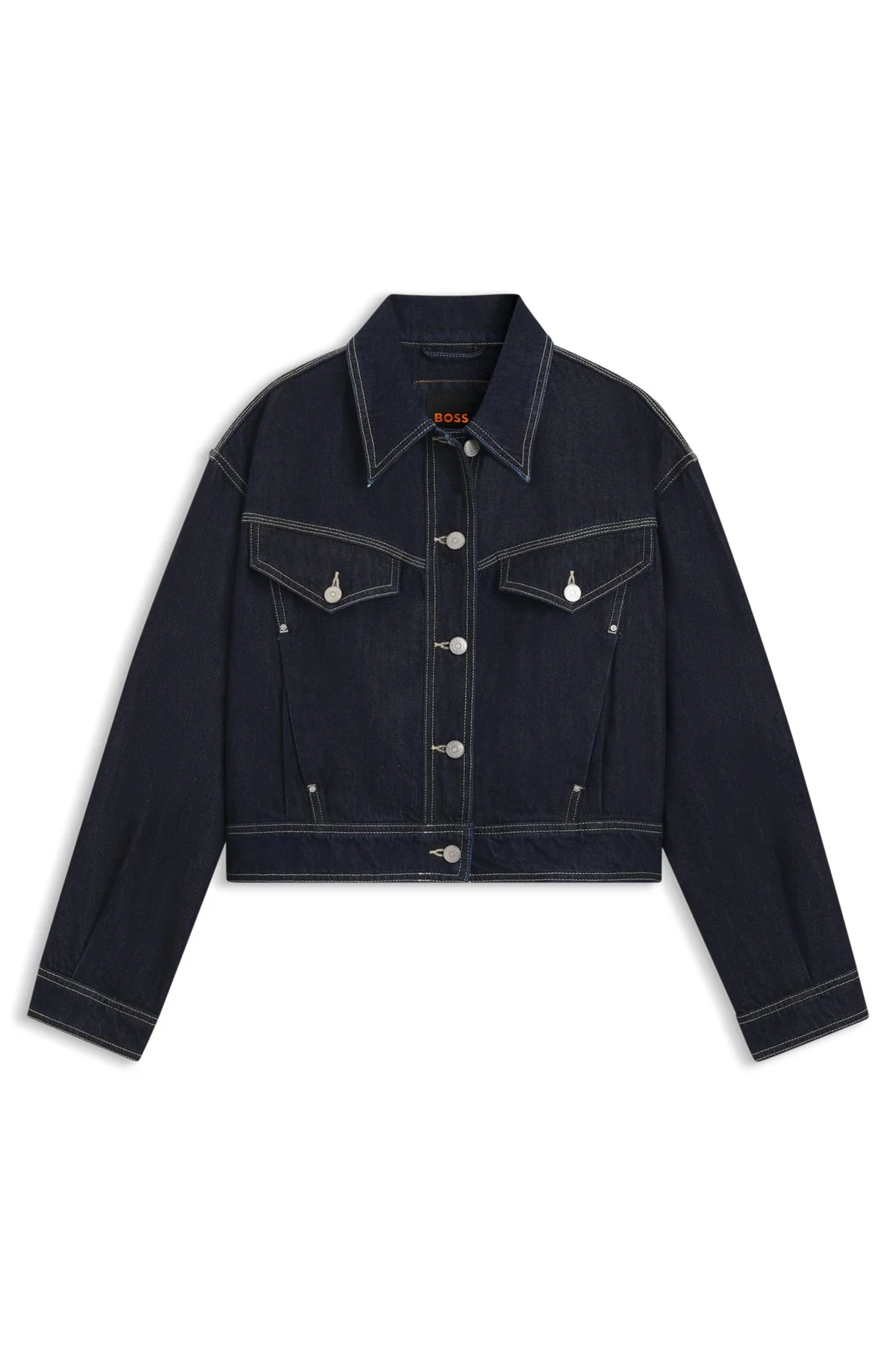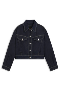 SIZE AND FIT The model wears a size S and is 5'11" tall with a, 31" chest, 23" waist and 34" hips. DETAILS Refresh your casuals with the clean rinse wash and cropped, straight fit of this BOSS Womenswear jacket. rigid denim. Contrast stitching. Regular fit Short length C_BOMBER TRUCKER 1.0 - 50552464 QUALITY & CARE INSTRUCTIONS Do Not Bleach Machine Wash Cold Gentle Do Not Tumble Dry Do Not Dry Clean Iron Medium Heat Material: 60% Cotton, 40% Lyocell, pocketing: 70% Polyester, 30% Cotton