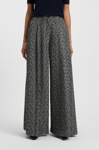 SIZE AND FIT The model wears a size 4 and is 5'10" tall with a, 29" chest, 23" waist and 33" hips. DETAILS Combining heritage tweed with a contemporary cut, these BOSS Womenswear trousers are an instant classic. Blended with linen. Pleated leg with macro herringbone. Regular fit High rise Button and zip closure Wide leg Pleat front Pockets bottom front: French pocket Pockets bottom back: Welt pocket Tetosa2 - 50548286 QUALITY & CARE INSTRUCTIONS Do Not Bleach Quality: 48% Cotton, 28% Linen, 20% Polyester, 4% Other fibres, pocketing: 55% Polyester, 45% Viscose Do Not Wash Reduced Dry Clean Iron Low Heat Do Not Tumble Dry