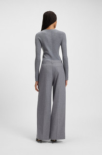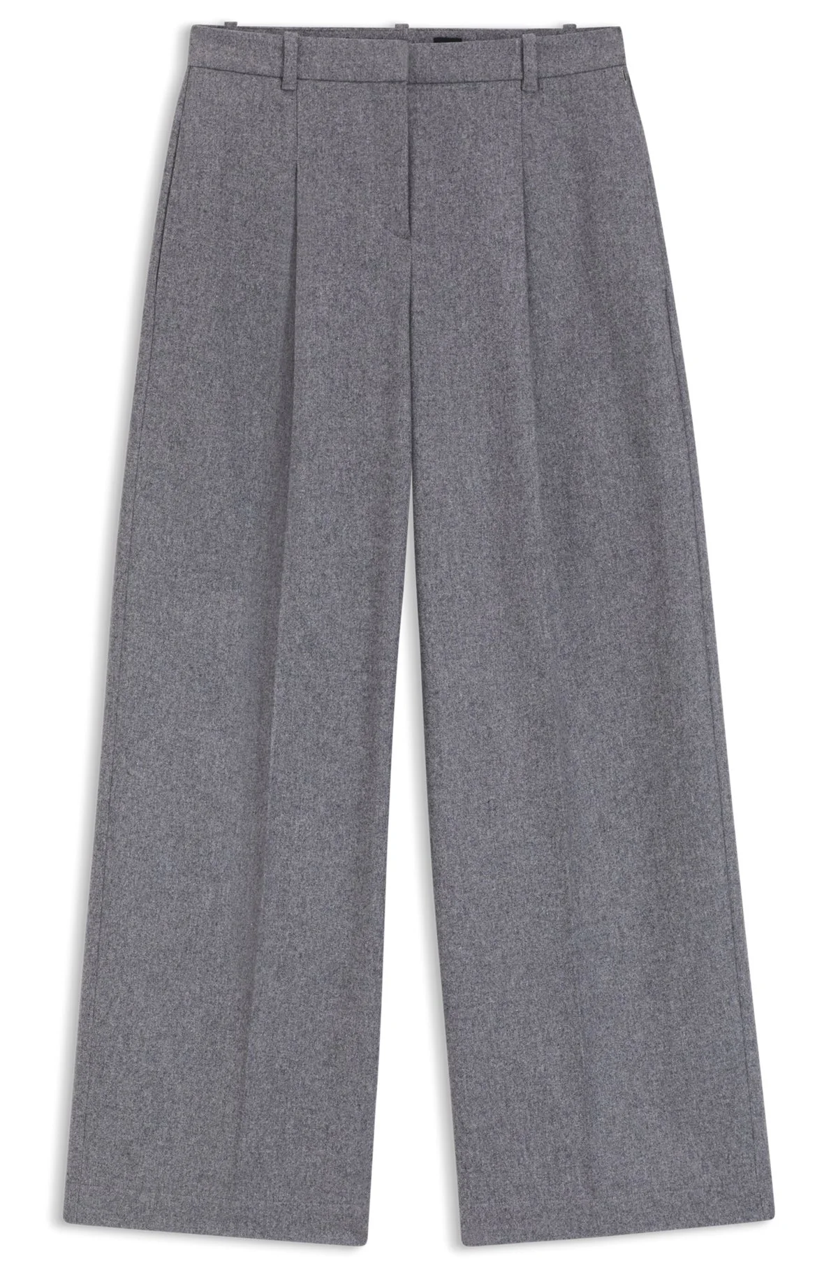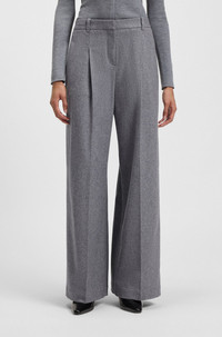 SIZE AND FIT The model wears a size 4 and is 5'9" tall with a, 32" chest, 23" waist and 35" hips. DETAILS Tiana4 - 50548280 Crafted in wintry flannel blended with wool, these BOSS Womenswear trousers have a modern straight fit with a wide leg. Extra-long length. Melange texture. Regular fit Regular rise Hook and zip closure Wide leg Crease Pockets bottom front: Side pockets Pockets bottom back: Welt pocket Fit foot width: 62,0 cm (24.4 inches) QUALITY & CARE INSTRUCTIONS Do Not Tumble Dry Reduced Dry Clean Quality: 44% Wool, 35% Lyocell, 21% Polyamid, pocketing: 55% Polyester, 45% Viscose Iron Low Heat Do Not Wash Do Not Bleach