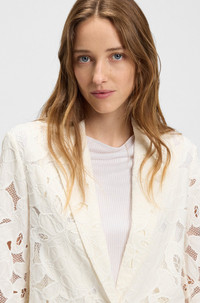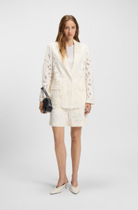 DETAILS Jonara - 50548573 With elegant embroidery, this BOSS Womenswear blazer is crafted in an extra-soft bamboo blend. Modern laid-back fit with a single-button closure. Relaxed fit Notched lapels Fastening top: Button closure Number of buttons: 1 Pockets top: Flap pockets Fit back length: 70 cm (28 inches) QUALITY & CARE INSTRUCTIONS Dry Clean Only Machine Wash Cold Gentle Iron Low Heat Do Not Tumble Dry Quality: 70% Polyester, 29% Viscose (Bamboo - Cellulose), 1% Polyamid, Components: 54% Viscose (Bamboo - Cellulose), 46% Polyester Do Not Bleach