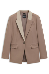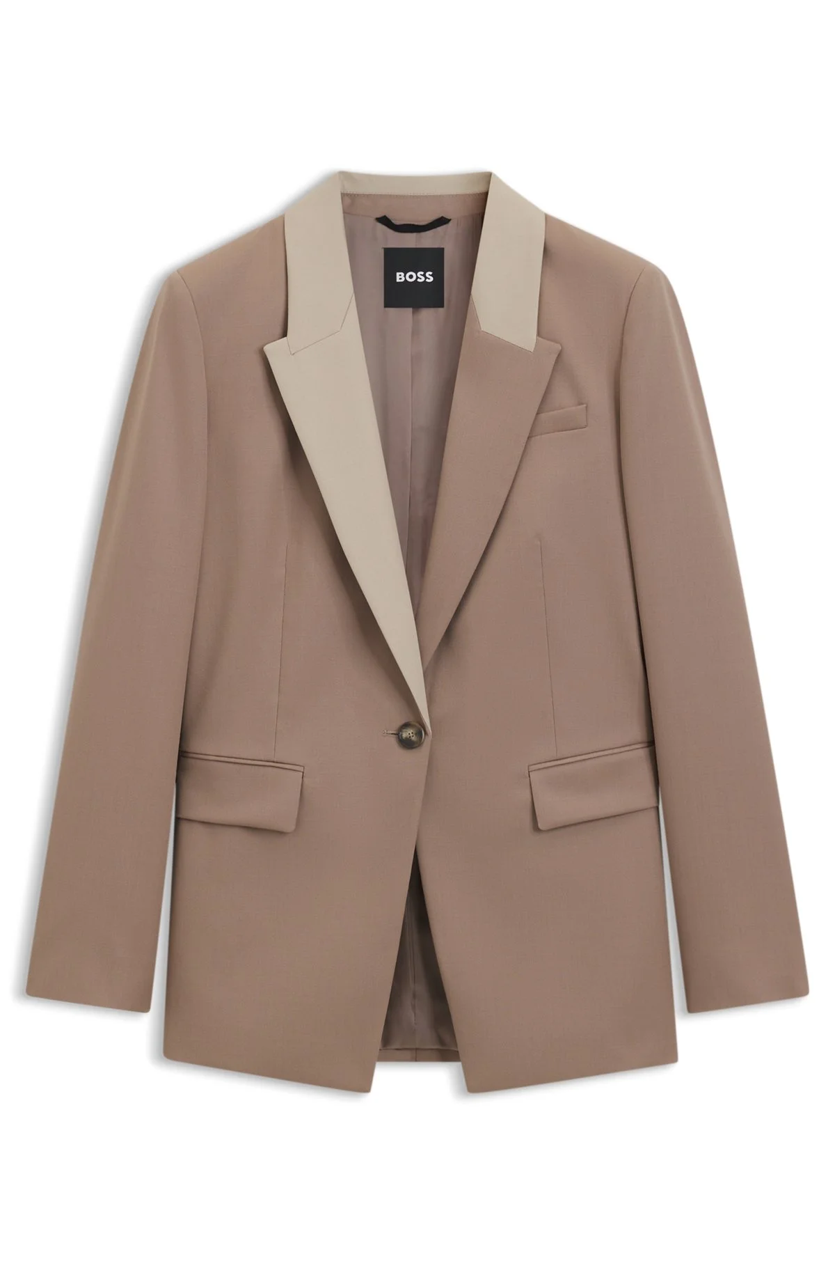 SIZE AND FIT The model wears a size 4 and is 5'9" tall with a, 31" chest, 24" waist and 35" hips. DETAILS Janka6 - 50543409 With its relaxed fit and color-blocked lapels, this BOSS Womenswear blazer is a statement formal option. Soft virgin-wool twill. Rear logo detail. Relaxed fit Notched lapels Fastening top: Button closure Number of buttons: 1 Welt chest pockets Pockets top: Flap pockets Side vent Fully lined Fit back length: 72 cm (28 inches) QUALITY & CARE INSTRUCTIONS Reduced Dry Clean Do Not Tumble Dry Quality: 100% Virgin wool, Lining: 55% Polyester, 45% Viscose Do Not Bleach Iron Low Heat Do Not Wash