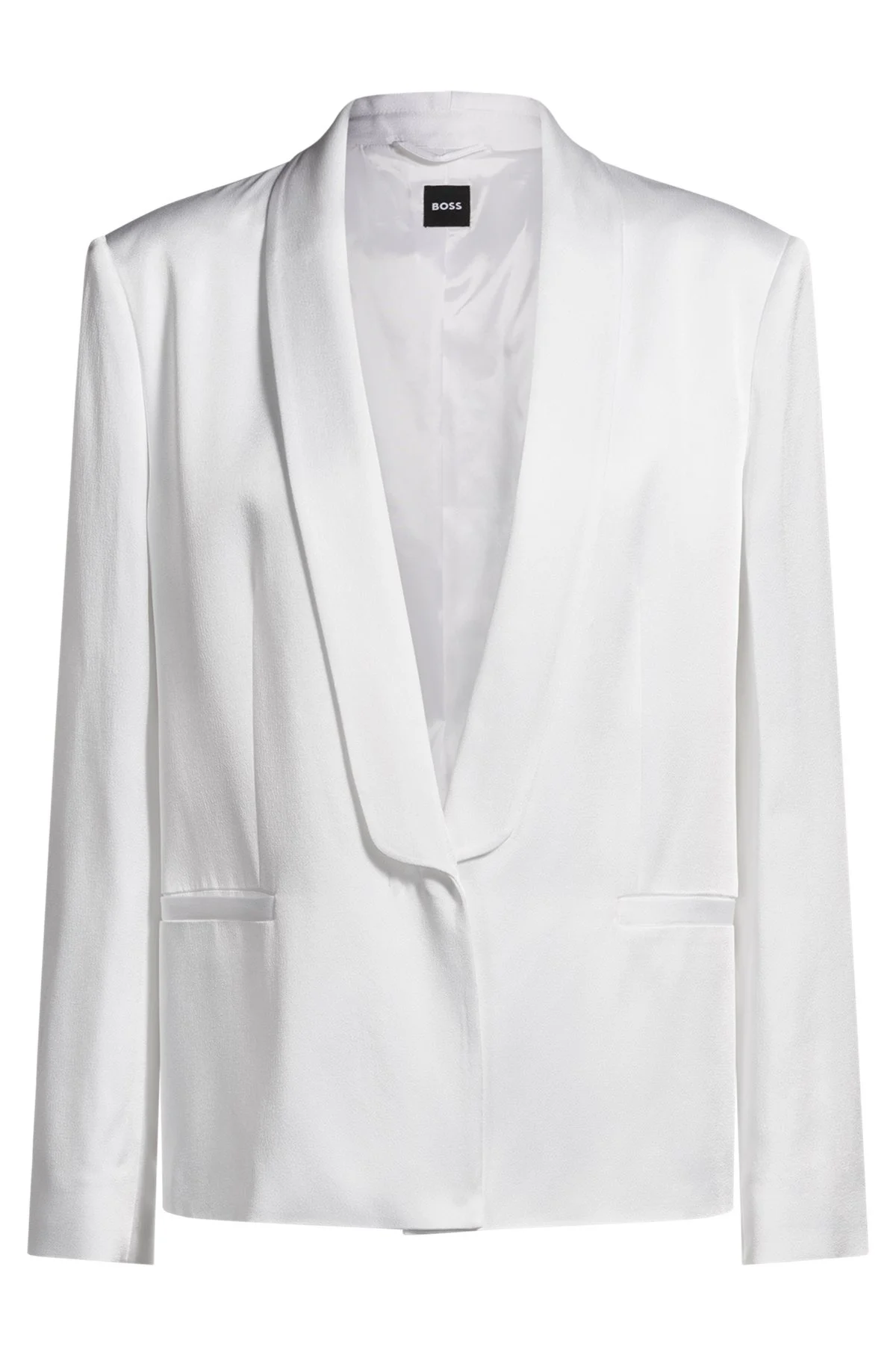 SIZE AND FIT The model wears a size 4 and is 5'10" tall with a, 31" chest, 24" waist and 35" hips. DETAILS Janka3 - 50537473 Create a modern suit by pairing this BOSS Womenswear blazer with the coordinating trousers. Laid-back fit in drapey fabric with clean lapels. Relaxed fit Shawl collar Fastening top: Concealed closure Number of buttons: 1 Pockets top: Welt pockets Fit back length: 64 cm (25 inches) QUALITY & CARE INSTRUCTIONS Quality: 72% Acetate, 28% Viscose, Lining: 64% Viscose, 36% Polyester Iron Low Heat Do Not Wash Reduced Dry Clean Do Not Bleach Do Not Tumble Dry