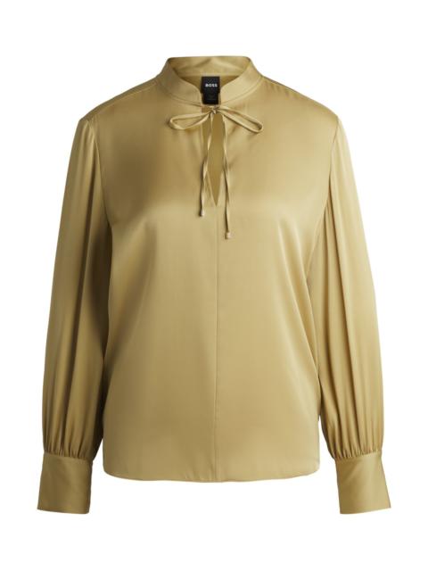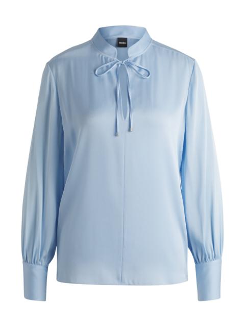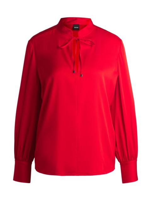 SIZE AND FIT The model wears a size 4 and is 5'9" tall with a, 31" chest, 24" waist and 35" hips. DETAILS Barabi - 50538492 A relaxed-fit blouse by BOSS Womenswear. Featuring a keyhole neckline with a hardware-tipped tie, this piece is crafted in stretch silk. Relaxed fit Stand collar Long sleeves Button cuffs Fit back length: 64 cm (25 inches) QUALITY & CARE INSTRUCTIONS Do Not Tumble Dry Quality: 90% Silk, 10% Elastane Reduced Dry Clean Do Not Wash Do Not Bleach Iron Low Heat
