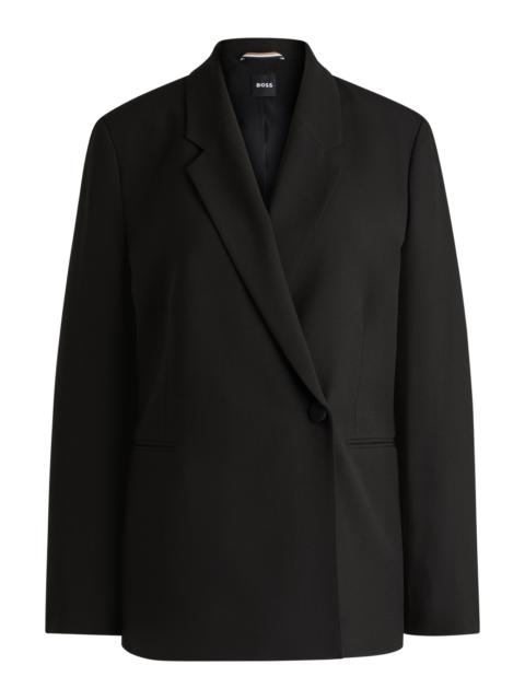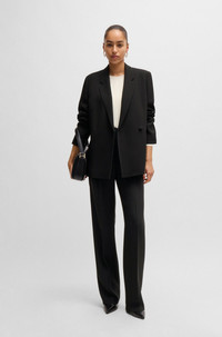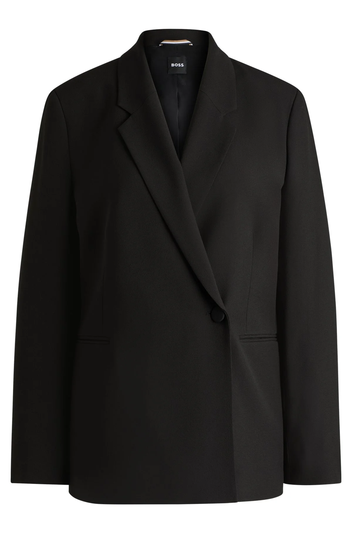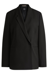 SIZE AND FIT The model wears a size 2 and is 5'9" tall with a, 32" chest, 23" waist and 35" hips. DETAILS Jozera - 50518433 A relaxed-fit jacket by BOSS Womenswear. Detailed with a feature button and tonal contrasts at the arms, this style is crafted in matte fabric. Relaxed fit Notched lapels Fastening top: Button closure Number of buttons: 1 Pockets top: Welt pockets Slit cuffs No vent Fully lined Fit back length: 70 cm (28 inches) QUALITY & CARE INSTRUCTIONS Reduced Dry Clean Do Not Bleach Do Not Tumble Dry Quality: 72% Acetate, 28% Viscose, Lining: 64% Viscose, 36% Polyester Do Not Wash Iron Low Heat