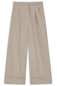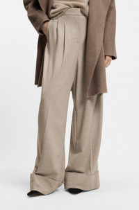 DETAILS In a roomy, wide-leg fit with an extra-long length, these BOSS Womenswear trousers offer a modern building block. Virgin wool with natural stretch. Relaxed fit Regular rise Hook and zip closure Wide leg Pleat front Pockets bottom front: French pocket Pockets bottom back: Welt pocket Fit foot width: 69,0 cm (27.2 inches) Taniada - 50550804 QUALITY & CARE INSTRUCTIONS Iron Low Heat Material: 100% Virgin wool, Waistband: 100% Cotton, pocketing: 100% Cupro Do Not Tumble Dry Do Not Bleach Do Not Wash Reduced Dry Clean