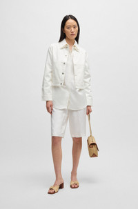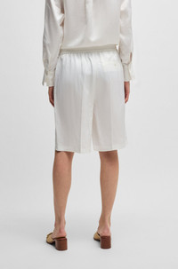 SIZE AND FIT The model wears a size 4 and is 5'10" tall with a, 31" chest, 23" waist and 35" hips. DETAILS Telini - 50537403 With a loose fit and clean closure, these high-waisted BOSS Womenswear shorts make a streamlined foundation. Blended with linen for breathable comfort. Relaxed fit High rise Wide leg Fit foot width: 62,0 cm (24.4 inches) QUALITY & CARE INSTRUCTIONS Iron Low Heat Do Not Wash Reduced Dry Clean Do Not Bleach Quality: 59% Viscose, 41% Linen, pocketing: 64% Viscose, 36% Polyester Do Not Tumble Dry