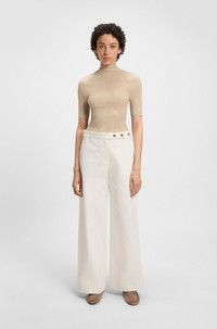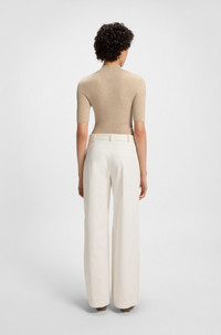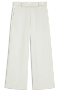 SIZE AND FIT The model wears a size 4 and is 5'10" tall with a, 31" chest, 24" waist and 35" hips. DETAILS Tiana8 - 50543286 Cut in comfortable cotton canvas, these BOSS Womenswear trousers strike a modern note. Relaxed fit with a wide leg and belt detail with hardware trims. Relaxed fit Regular rise Hook and zip closure Belted closure Wide leg Pockets bottom front: Side pockets Pockets bottom back: Welt pocket Fit foot width: 66,4 cm (26.1 inches) QUALITY & CARE INSTRUCTIONS Reduced Dry Clean Do Not Bleach Do Not Tumble Dry Do Not Wash Iron Low Heat Quality: 100% Cotton, pocketing: 100% Cotton, Belt: 100% Viscose