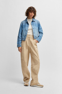 SIZE AND FIT The model wears a size 4 and is 5'9" tall with a, 31" chest, 24" waist and 35" hips. DETAILS Telara-W - 50537794 With casual pocket detailing, these high-waisted BOSS Womenswear trousers are easy to style. Cut with a tapered leg in summery stretch-cotton twill. Relaxed fit High rise Hook and zip closure Tapered leg Pockets bottom back: Welt pocket Fit foot width: 47,0 cm (18.5 inches) QUALITY & CARE INSTRUCTIONS Quality: 98% Cotton, 2% Elastane, pocketing: 100% Cotton Machine Wash Cold Gentle Do Not Tumble Dry Reduced Dry Clean Iron Low Heat Do Not Bleach