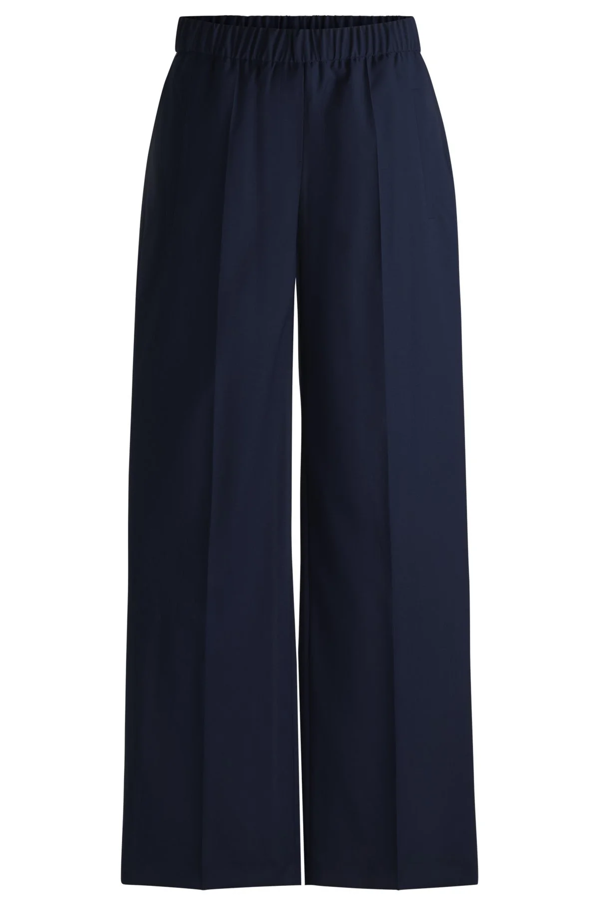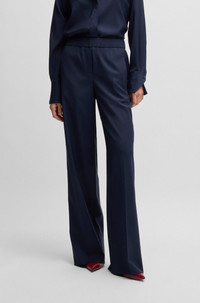 SIZE AND FIT The model wears a size 4 and is 5'9" tall with a, 31" chest, 24" waist and 35" hips. DETAILS Toyal - 50534567 These easy-wear trousers by BOSS Womenswear are cut to a relaxed fit in wool. Elasticated waistband for all-day comfort. Wide leg. Relaxed fit High rise Wide leg Fit foot width: 56,0 cm (22.0 inches) QUALITY & CARE INSTRUCTIONS Quality: 100% Virgin wool, pocketing: 100% Cotton Do Not Tumble Dry Do Not Bleach Do Not Wash Iron Low Heat Reduced Dry Clean