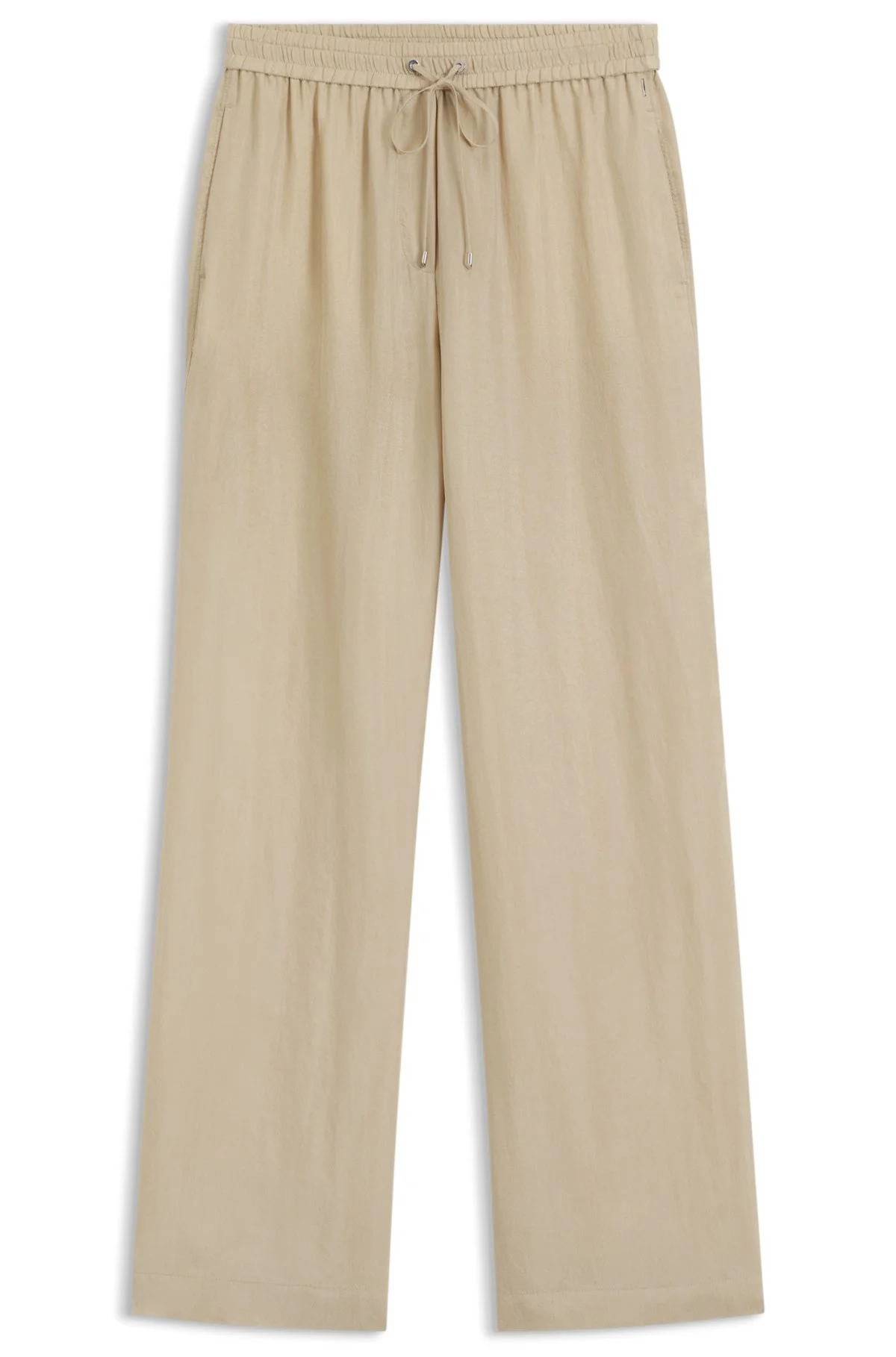 SIZE AND FIT Relaxed fit The model wears a size 4 and is 5'9" tall with a, 30" chest, 23" waist and 35" hips. DETAILS Designed with a relaxed, straight-leg fit, these BOSS Womenswear trousers are cut in soft fabric with a smooth finish. Hardware-tipped drawcord waist. Relaxed fit Regular rise Elastic Waistband Straight leg Pockets bottom front: Side pockets Tavati2 - 50556231 QUALITY & CARE INSTRUCTIONS Iron Low Heat Do Not Wash Material: 100% Lyocell, pocketing: 100% Viscose Do Not Bleach Reduced Dry Clean Do Not Tumble Dry