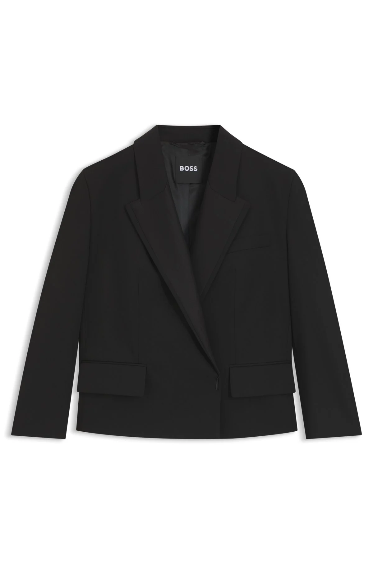 SIZE AND FIT The model wears a size 4 and is 5'9" tall with a, 32" chest, 23" waist and 35" hips. DETAILS With its tuxedo styling and modern closure, this relaxed-fit BOSS Womenswear blazer is a reinterpreted take on a classic. Crafted in virgin-wool twill. Relaxed fit Peaked lapels Fastening top: Concealed closure Pockets top: Flap pockets Fully lined Fit back length: 58 cm (23 inches) Janeva - 50548304 QUALITY & CARE INSTRUCTIONS Quality: 100% Virgin wool, Lining: 55% Polyester, 45% Viscose, Insert: 88% Virgin wool, 12% Polyamid Iron Low Heat Do Not Tumble Dry Reduced Dry Clean Do Not Bleach Do Not Wash