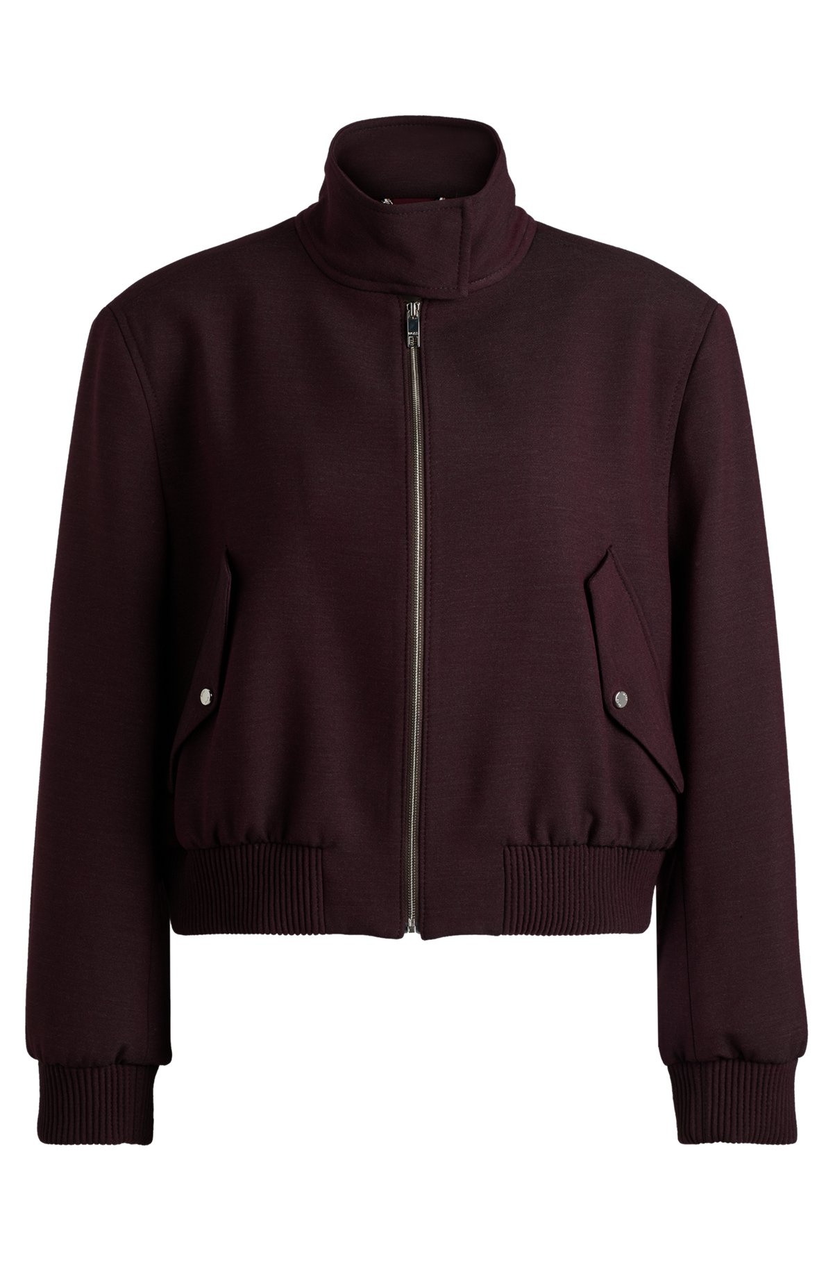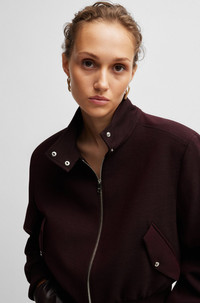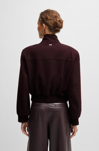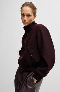 SIZE AND FIT The model wears a size 4 and is 5'10" tall with a, 30" chest, 23" waist and 35" hips. DETAILS Jamaya - 50518457 A cropped jacket in a relaxed fit by BOSS Womenswear. This zip-up design is crafted in stretch twill with a melange finish. Relaxed fit Stand collar Fastening top: Zip closure Pockets top: Flap pockets Ribbed cuffs Fully lined Cropped Fit back length: 50 cm (20 inches) QUALITY & CARE INSTRUCTIONS Reduced Dry Clean Do Not Bleach Do Not Tumble Dry Quality: 68% Polyester, 28% Viscose, 4% Elastane, Lining: 64% Viscose, 36% Polyester Do Not Wash Iron Low Heat
