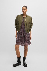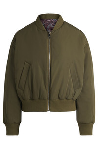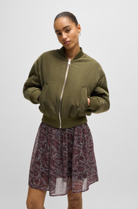 SIZE AND FIT The model wears a size 4 and is 6'1" tall with a, 37" chest, 29" waist and 35" hips. DETAILS C_Pikomba - 50521621 A contemporary bomber jacket with a water-repellent finish by BOSS Womenswear. This modern piece is reversible for two looks in one. Regular fit Fastening top: Zip closure Pockets top: Welt pockets Fully lined Fit back length: 54 cm (21 inches) QUALITY & CARE INSTRUCTIONS Do Not Bleach Tumble Dry Low Heat Quality: 100% Polyester, Wadding: 100% Polyester, reversible jacket inside: 96% Polyester, 4% Elastane, Cuff / Waistband / Collar: 44% Polyester, 30% Polyacrylic, 20% Polyamid, 6% Wool Do Not Dry Clean Iron Low Heat Machine Wash Cold Gentle
