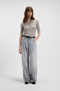 DETAILS C_Fugano - 50543977 Perfect under tailoring or for everyday elegance, this BOSS Womenswear knit polo comes in exceptionally soft wool. Flattering ribbed structure. Slim fit Neckline: Polo collar Short sleeves Standard length QUALITY & CARE INSTRUCTIONS Hand Wash Only Reduced Dry Clean Iron Low Heat Do Not Tumble Dry Do Not Bleach Quality: 60% Virgin wool, 40% Polyamid