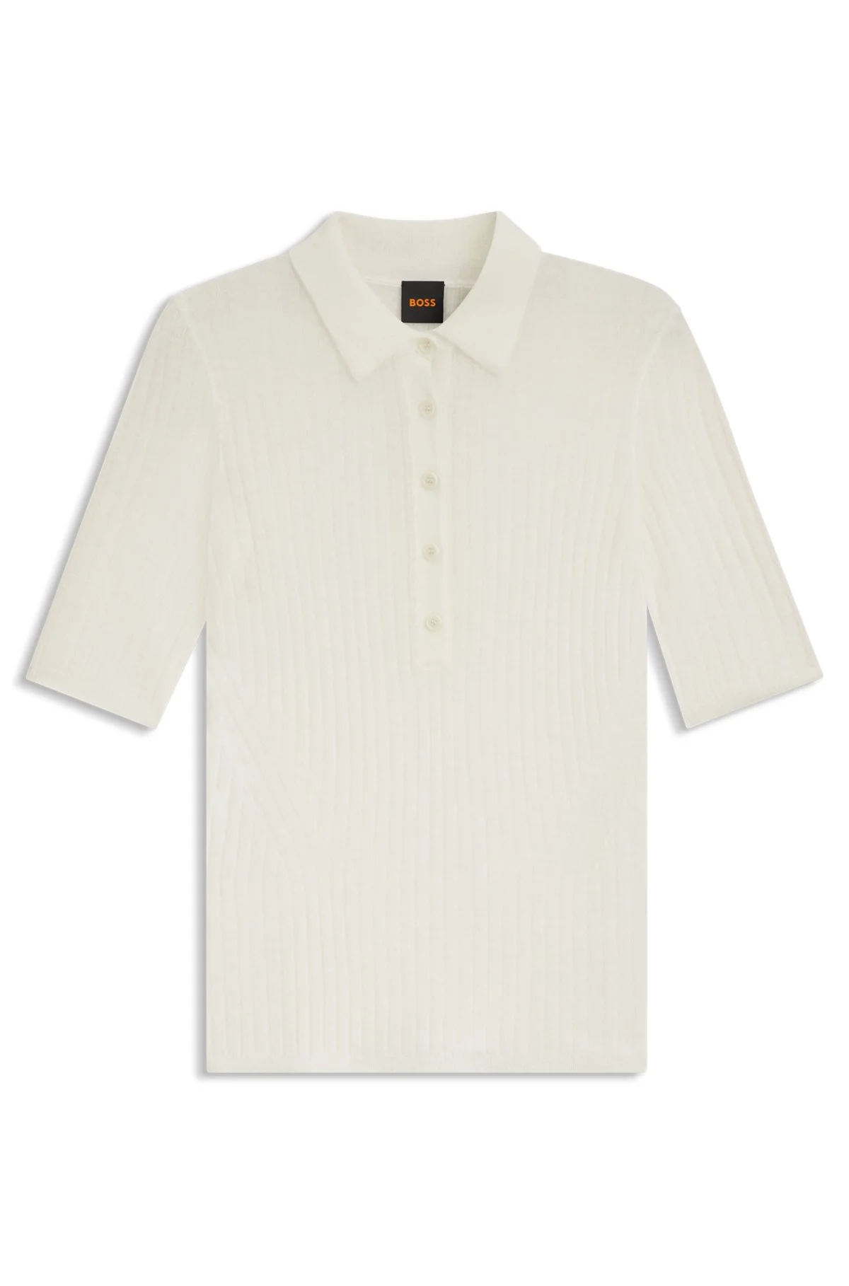DETAILS C_Fugano - 50543977 Perfect under tailoring or for everyday elegance, this BOSS Womenswear knit polo comes in exceptionally soft wool. Flattering ribbed structure. Slim fit Neckline: Polo collar Short sleeves Standard length QUALITY & CARE INSTRUCTIONS Quality: 60% Virgin wool, 40% Polyamid Hand Wash Only Do Not Tumble Dry Do Not Bleach Iron Low Heat Reduced Dry Clean