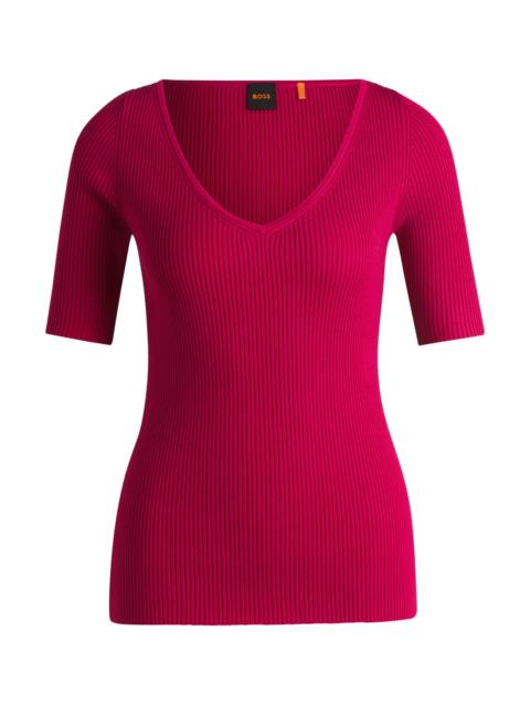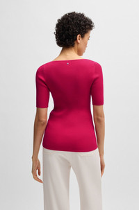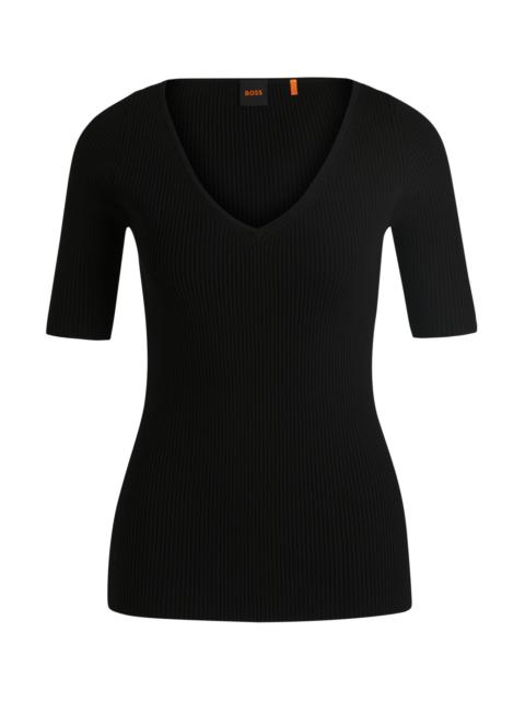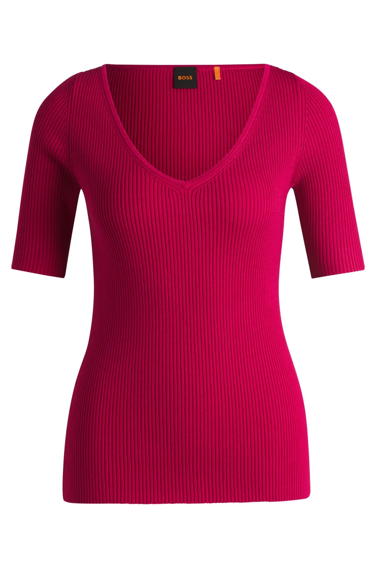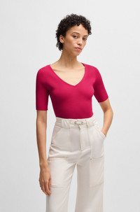 SIZE AND FIT The model wears a size S and is 5'10" tall with a, 31" chest, 24" waist and 35" hips. DETAILS C_Faradisco - 50534829 A versatile short-sleeved sweater by BOSS. This slim-fitting piece is knitted in a stretch blend and topped with a V neckline. Slim fit QUALITY & CARE INSTRUCTIONS Do Not Bleach Do Not Tumble Dry Hand Wash Only Quality: 72% Viscose, 28% Polyester Do Not Dry Clean Iron Low Heat