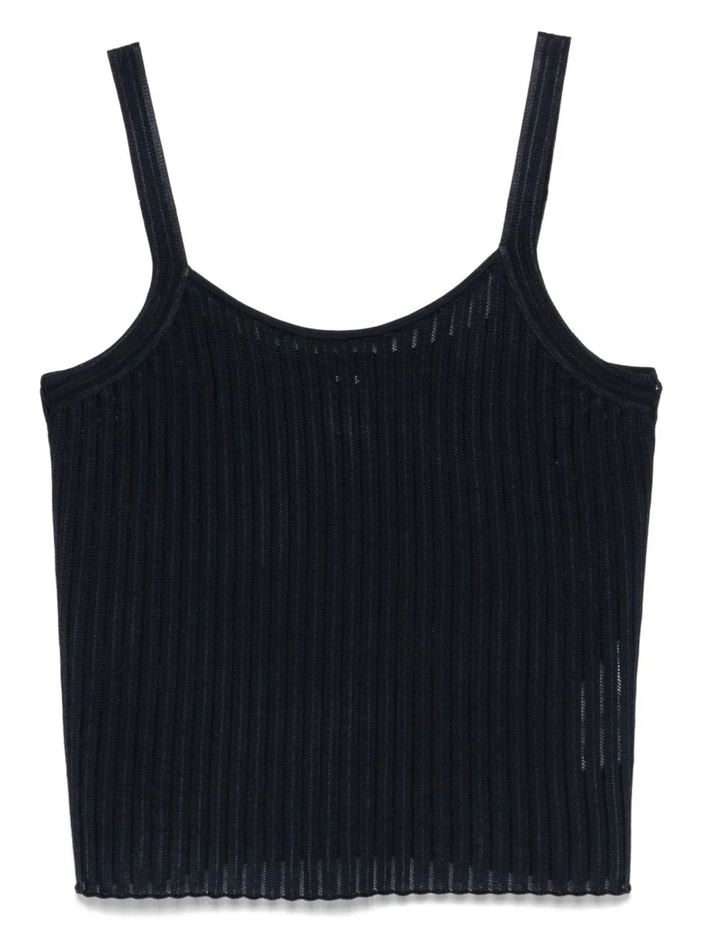 ribbed tank top Highlights - Black - Round neck - Sleeveless - Semi-sheer construction Imported Composition Recycled Viscose 85%, Polyamide 13%, Elastane 2% SIZE & FIT Model measurements Height 5 ft 9 in(1.75 m) Bust/Chest 34.64 in(88 cm) Hips 36.61 in(93 cm) Waist 26.37 in(67 cm) FittingInformation Designed for a slim fit that sits just away from the body offering a close yet comfortable fit Made from a midweight stretch fabric, this piece offers elasticity and flexibility when worn Washing instructions Hand Wash