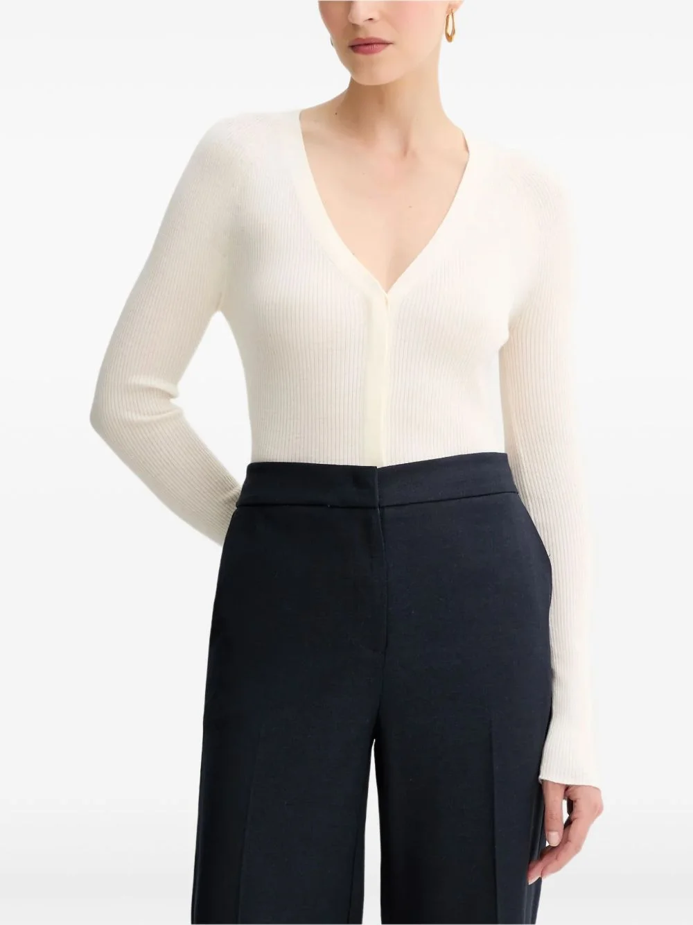 ribbed V-neck cardigan Highlights - Off-white - Ribbed knit - V-neck - Long sleeves - Concealed front button fastening Imported Composition Wool 100% Washing instructions Read Manufacturer Guidelines