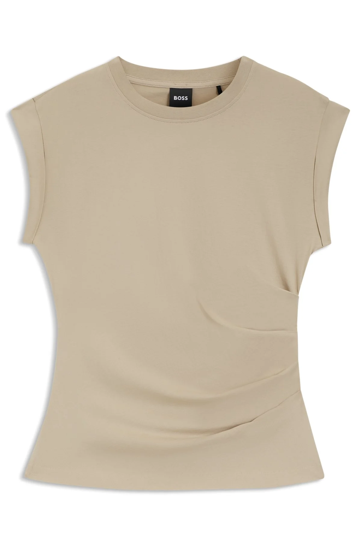 DETAILS Create effortless casual looks with the rolled cuffs and emphasized shoulders of this BOSS Womenswear T-shirt. Slim cut in extra-soft mercerized cotton. Slim fit Neckline: Crew neck Short sleeves Epka - 50555827 QUALITY & CARE INSTRUCTIONS Material: 100% Cotton, Ribbing: 100% Cotton Do Not Bleach Do Not Tumble Dry Machine Wash Cold Gentle Do Not Dry Clean Iron Low Heat