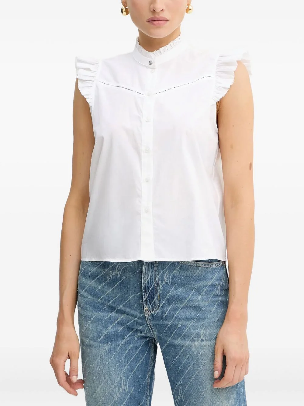 ruffle-embellished sleeveless top Highlights - White - Ruffled trim - Sleeveless design - Button fastening - Mock neck Imported Composition Cotton 100% Washing instructions Read Manufacturer Guidelines