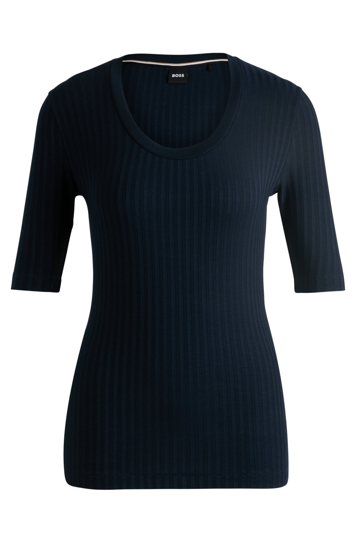 SIZE AND FIT The model wears a size S and is 5'10" tall with a, 30" chest, 23" waist and 35" hips. DETAILS Effilie - 50518508 A ribbed top with cropped sleeves, by BOSS Womenswear. Featuring a scoop neckline, this design is crafted in soft stretch fabric. Slim fit Short sleeves QUALITY & CARE INSTRUCTIONS Iron Low Heat Quality: 96% Lyocell, 4% Elastane Do Not Bleach Cold, gentle machine wash; reduced spin speed. Do Not Tumble Dry Do Not Dry Clean