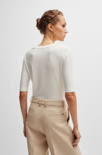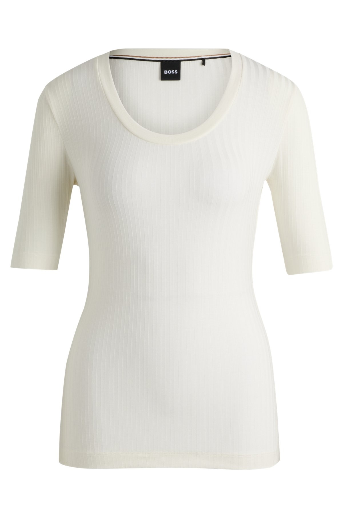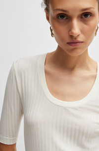 SIZE AND FIT The model wears a size S and is 5'10" tall with a, 30" chest, 23" waist and 35" hips. DETAILS Effilie - 50518508 A ribbed top with cropped sleeves, by BOSS Womenswear. Featuring a scoop neckline, this design is crafted in soft stretch fabric. Slim fit Short sleeves QUALITY & CARE INSTRUCTIONS Iron Low Heat Quality: 96% Lyocell, 4% Elastane Do Not Bleach Cold, gentle machine wash; reduced spin speed. Do Not Tumble Dry Do Not Dry Clean