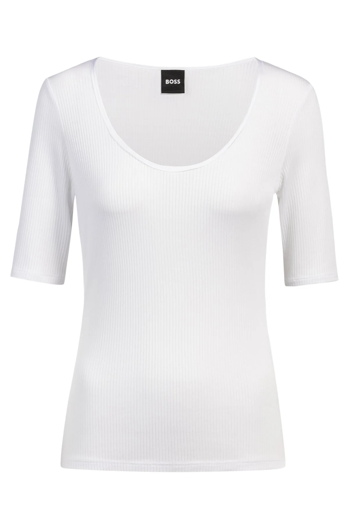 SIZE AND FIT The model wears a size S and is 5'10" tall with a, 31" chest, 24" waist and 35" hips. DETAILS Ejita - 50537596 A versatile foundation, this BOSS Womenswear T-shirt has a ribbed structure for form-fitting effect. Deep scoop neckline and cropped sleeves. Stretch fabric. Slim fit Neckline: Scoop neck 3/4 sleeves Fit back length: 58 cm (23 inches) QUALITY & CARE INSTRUCTIONS Iron Low Heat Quality: 100% Lyocell, Facing: 100% Viscose Do Not Bleach Cold, gentle machine wash; reduced spin speed. Reduced Dry Clean Do Not Tumble Dry