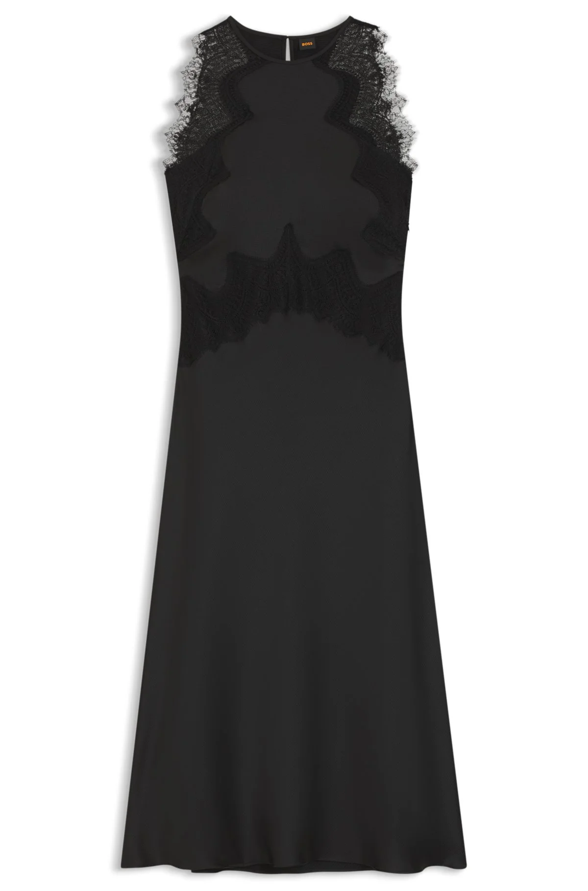 DETAILS With a form-fitting slip silhouette, this BOSS Womenswear dress creates romantic flow with its seersucker satin. Rich lace trims. Bias-cut skirt. Slim fit Neckline: Crew neck Sleeveless Fit back length: 125 cm (49 inches) C_Dlace - 50548394 QUALITY & CARE INSTRUCTIONS Iron Low Heat Do Not Tumble Dry Hand Wash Only Do Not Bleach Material: 99% Polyester, 1% Elastane, Insert: 100% Polyamid Do Not Dry Clean