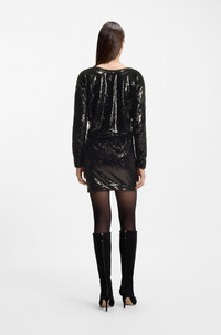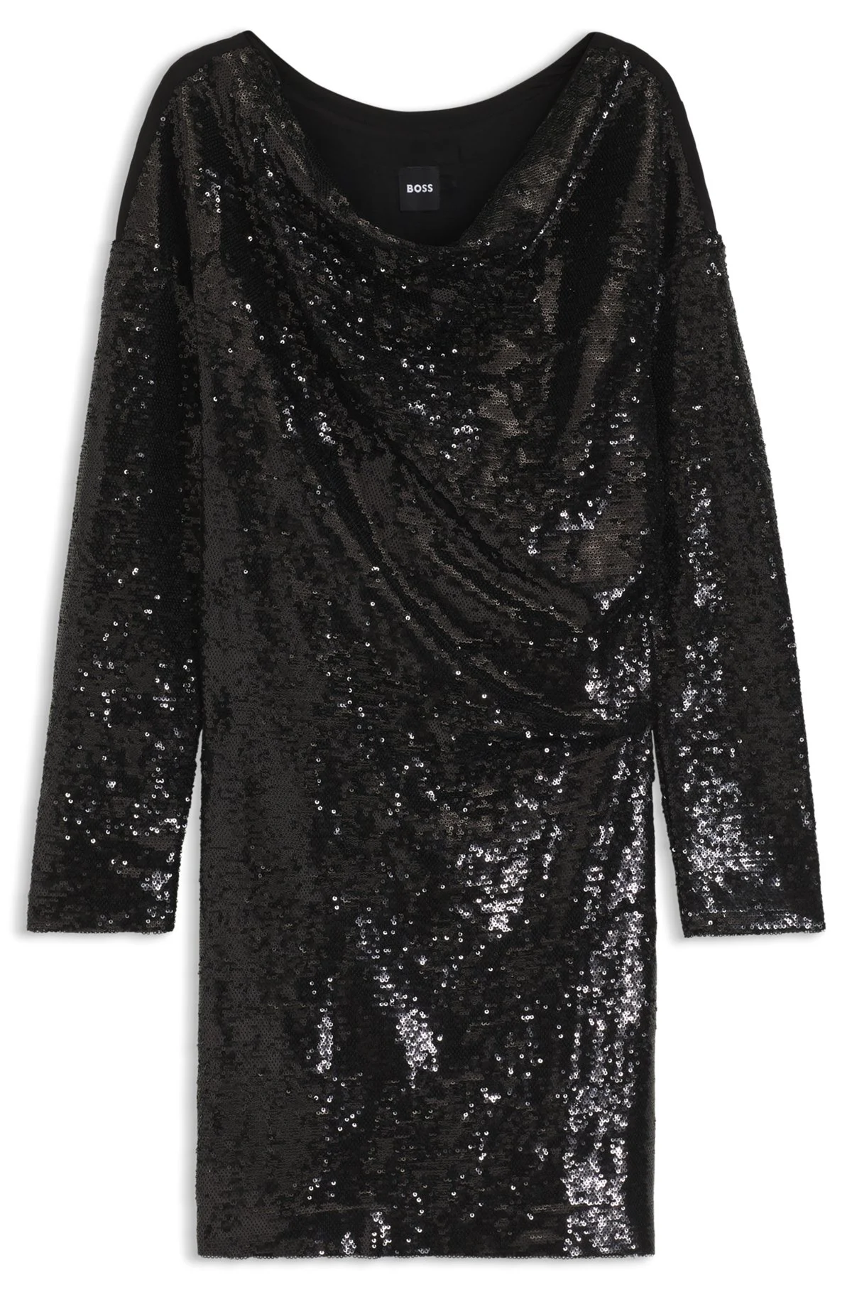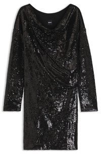 DETAILS With elegant draping and lustrous jersey inserts, this short BOSS Womenswear dress creates a party-ready look with its sequin embellishments. Extra-soft lining. Relaxed fit Neckline: Cascade Long sleeves Fully lined Ebiba - 50547996 QUALITY & CARE INSTRUCTIONS Do Not Bleach Do Not Dry Clean Do Not Tumble Dry Cold, gentle machine wash; reduced spin speed. Iron Low Heat Material: 100% Polyamid, Lining: 100% Viscose, Insert: 98% Viscose, 2% Elastane
