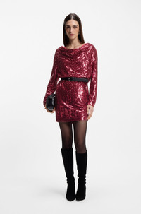 DETAILS With elegant draping and lustrous jersey inserts, this short BOSS Womenswear dress creates a party-ready look with its sequin embellishments. Extra-soft lining. Relaxed fit Neckline: Cascade Long sleeves Fully lined Ebiba - 50547996 QUALITY & CARE INSTRUCTIONS Do Not Bleach Do Not Dry Clean Do Not Tumble Dry Cold, gentle machine wash; reduced spin speed. Iron Low Heat Material: 100% Polyamid, Lining: 100% Viscose, Insert: 98% Viscose, 2% Elastane