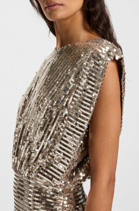 SIZE AND FIT The model wears a size 4 and is 5'10" tall with a, 33" chest, 23" waist and 34" hips. DETAILS Go for effortless evening glamour with this sequinned BOSS Womenswear dress. Its slim fit, with shoulder pads and gathered sides, creates a flattering silhouette. Slim fit Neckline: Crew neck Fastening top: Zip and button closure Sleeveless Fully lined Fit back length: 85 cm (33 inches) C_Dillana - 50548317 QUALITY & CARE INSTRUCTIONS Do Not Bleach Do Not Tumble Dry Material: 95% Polyester, 5% Elastane, Lining: 100% Polyester Dry Clean Only Do Not Wash Do Not Iron