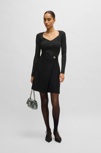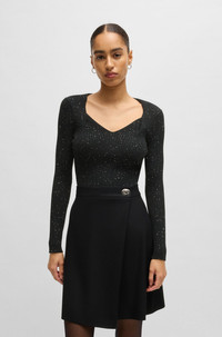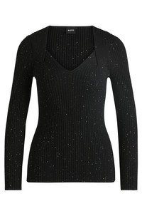 SIZE AND FIT The model wears a size S and is 5'9" tall with a, 32" chest, 23" waist and 35" hips. DETAILS Ferim - 50523744 A contemporary sweater with a feature neckline, by BOSS. Stitched with small sequins all over, this ribbed piece is crafted in flattering stretch fabric. Neckline: Wide neck Long sleeves QUALITY & CARE INSTRUCTIONS Hand Wash Only Do Not Tumble Dry Quality: 38% Viscose, 32% Polyester, 29% Polyamid, 1% Elastane Do Not Bleach Do Not Iron Do Not Dry Clean