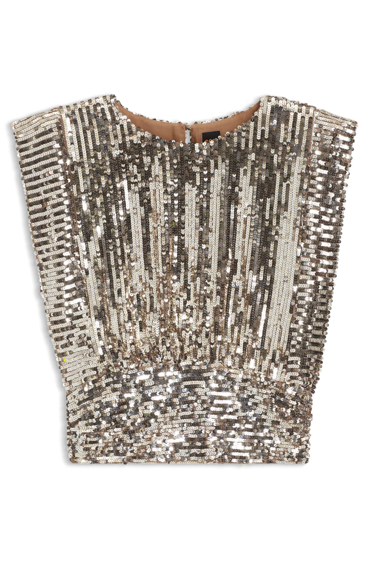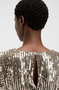 SIZE AND FIT The model wears a size 4 and is 5'11" tall with a, 31" chest, 23" waist and 34" hips. DETAILS Add sparkle to evening looks with this sequinned BOSS Womenswear top. Flattering gatherings at the side waist. Shoulder pads provide a structured silhouette. Regular fit Collarless Fastening top: Zip and button closure Sleeveless Fit back length: 50 cm (20 inches) C_Illana - 50548318 QUALITY & CARE INSTRUCTIONS Material: 95% Polyester, 5% Elastane, Lining: 100% Polyester Do Not Iron Do Not Wash Dry Clean Only Do Not Bleach Do Not Tumble Dry
