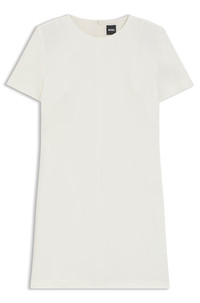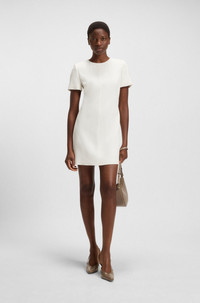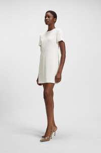 SIZE AND FIT The model wears a size 4 and is 5'10" tall with a, 31" chest, 24" waist and 35" hips. DETAILS Dindera - 50541993 Cut with a simple silhouette in soft crepe, this BOSS Womenswear dress is so easy to style. Neat rear zip with logo puller. Short sleeves Regular fit Neckline: Crew neck Fastening top: Zip closure Short sleeves Fit back length: 85 cm (33 inches) QUALITY & CARE INSTRUCTIONS Iron Low Heat Quality: 100% Viscose, Lining: 55% Polyester, 45% Viscose Reduced Dry Clean Do Not Bleach Do Not Wash Do Not Tumble Dry