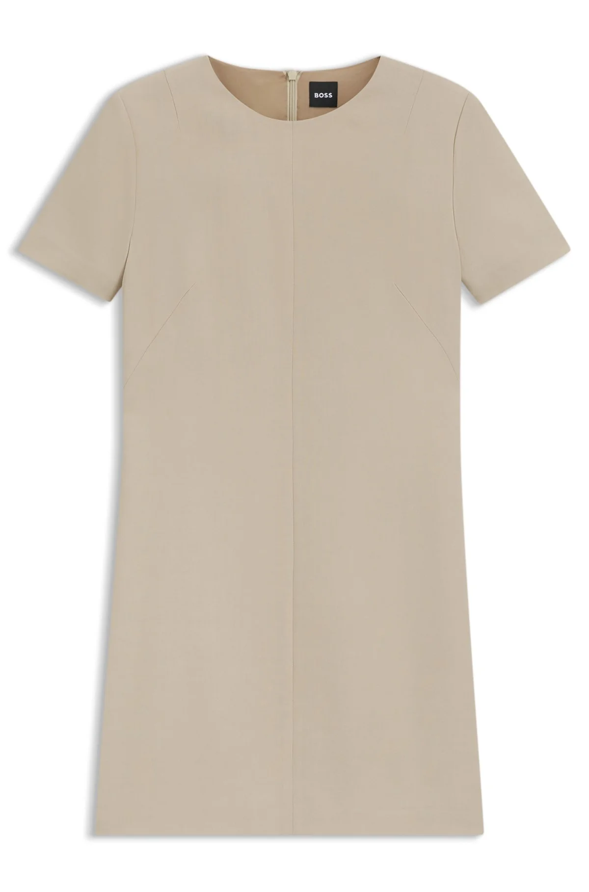 SIZE AND FIT The model wears a size 4 and is 5'10" tall with a, 31" chest, 23" waist and 35" hips. DETAILS Cut with a simple silhouette in soft crepe, this BOSS Womenswear dress is so easy to style. Neat rear zip with logo puller. Short sleeves Regular fit Neckline: Crew neck Fastening top: Zip closure Short sleeves Fit back length: 85 cm (33 inches) Dindera - 50541993 QUALITY & CARE INSTRUCTIONS Do Not Wash Iron Low Heat Reduced Dry Clean Do Not Bleach Do Not Tumble Dry Material: 100% Viscose, Lining: 55% Polyester, 45% Viscose
