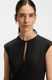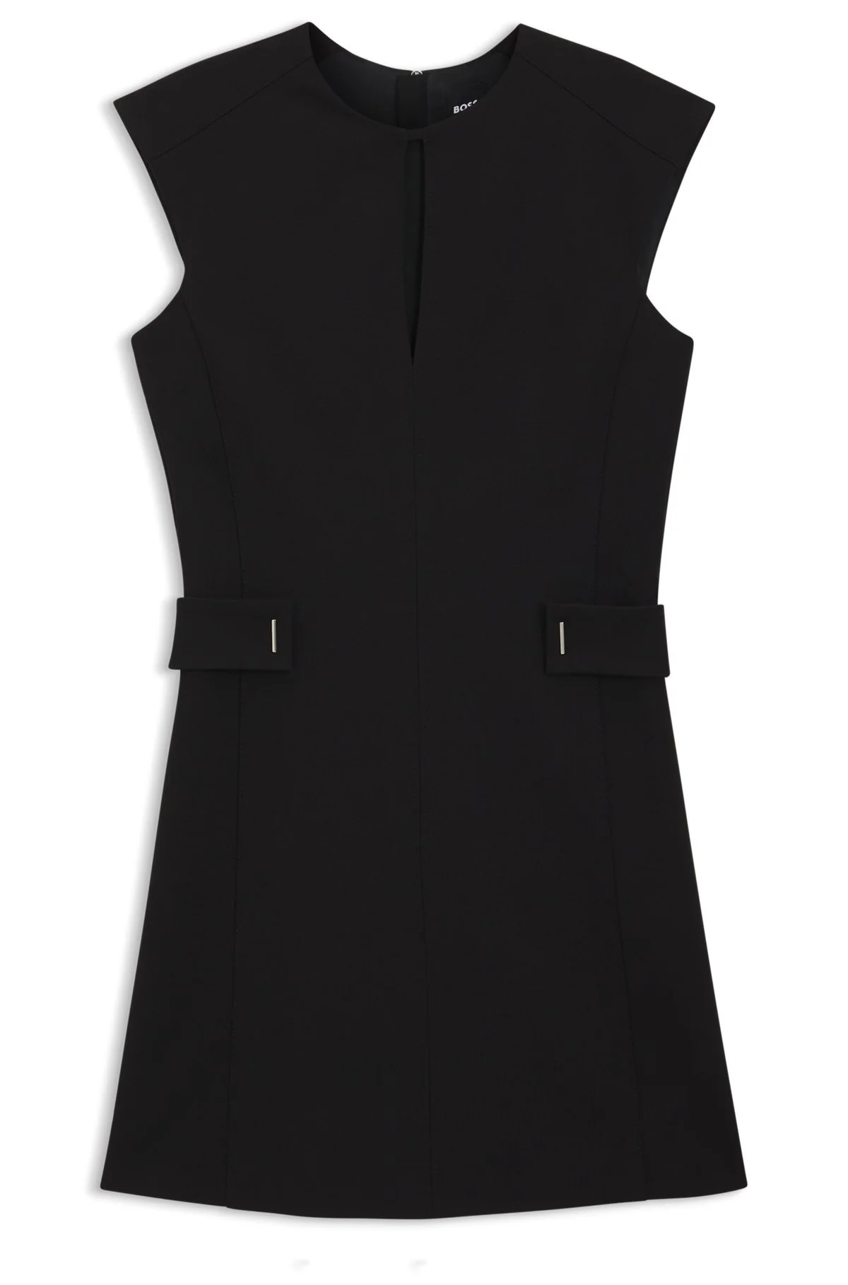 SIZE AND FIT The model wears a size 4 and is 5'10" tall with a, 31" chest, 24" waist and 35" hips. DETAILS Drumia - 50543277 Create easy business looks with the shift silhouette of this BOSS Womenswear dress. Stretch fabric with a keyhole neckline and modern belt detail. Regular fit Neckline: Crew neck Fastening top: Zip closure Sleeveless Fit back length: 86 cm (34 inches) QUALITY & CARE INSTRUCTIONS Do Not Wash Do Not Bleach Reduced Dry Clean Do Not Tumble Dry Quality: 65% Viscose, 30% Polyamid, 5% Elastane, Lining: 64% Viscose, 36% Polyester Iron Low Heat