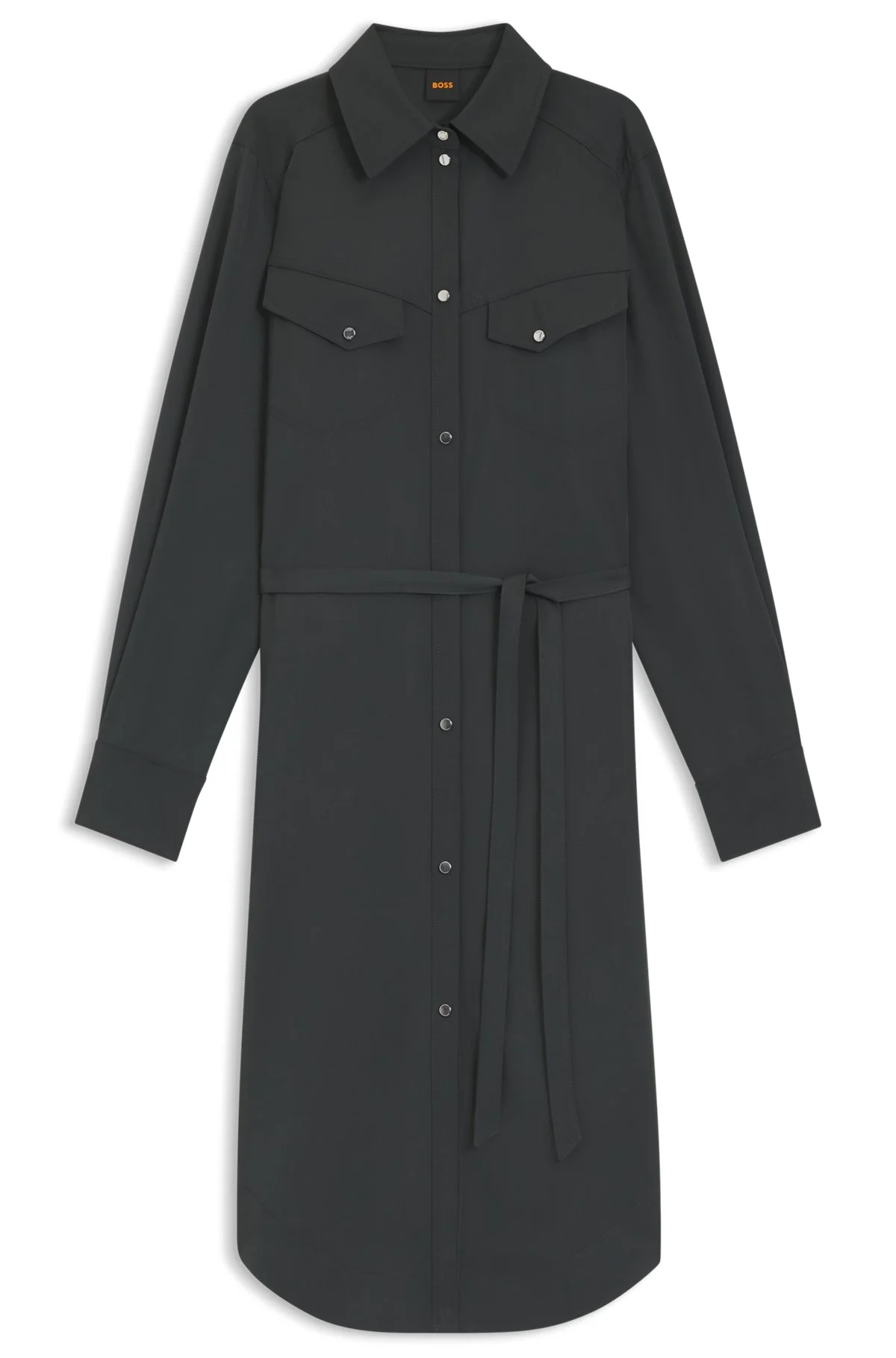SIZE AND FIT The model wears a size 2 and is 5'10" tall with a, 30" chest, 22" waist and 34" hips. DETAILS With a belt for a waist-cinching silhouette, this BOSS Womenswear shirt dress is effortlessly chic. Soft-touch sandwashed fabric. Denim-inspired detailing. Regular fit Neckline: Point collar Fastening top: Press-stud closure Long sleeves Button cuffs Front chest pockets Pockets top: Welt pockets Fit back length: 116 cm (46 inches) C_Darimita - 50551853 QUALITY & CARE INSTRUCTIONS Material: 75% Viscose, 25% Polyester Machine Wash Cold Gentle Do Not Bleach Do Not Tumble Dry Iron Low Heat Reduced Dry Clean